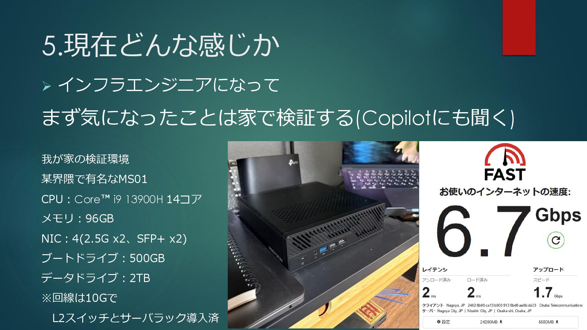 5.現在どんな感じか ➢ インフラエンジニアになって まず気になったことは家で検証する(Copilotにも聞く) 我が家の検証環境 某界隈で有名なMS01 CPU:Core i9 13900H 14コア
