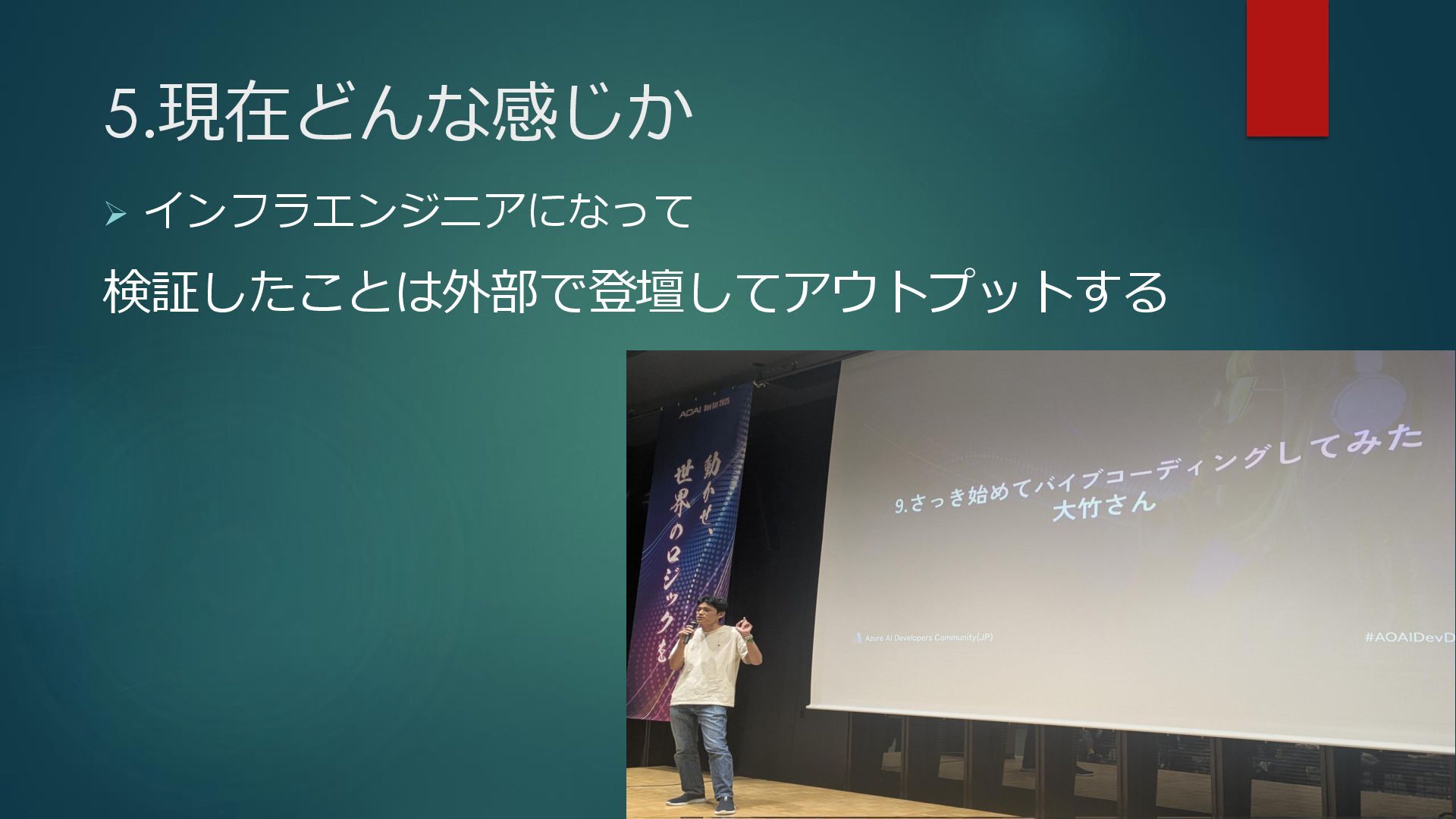 5.現在どんな感じか ➢ インフラエンジニアになって 検証したことは外部で登壇してアウトプットする