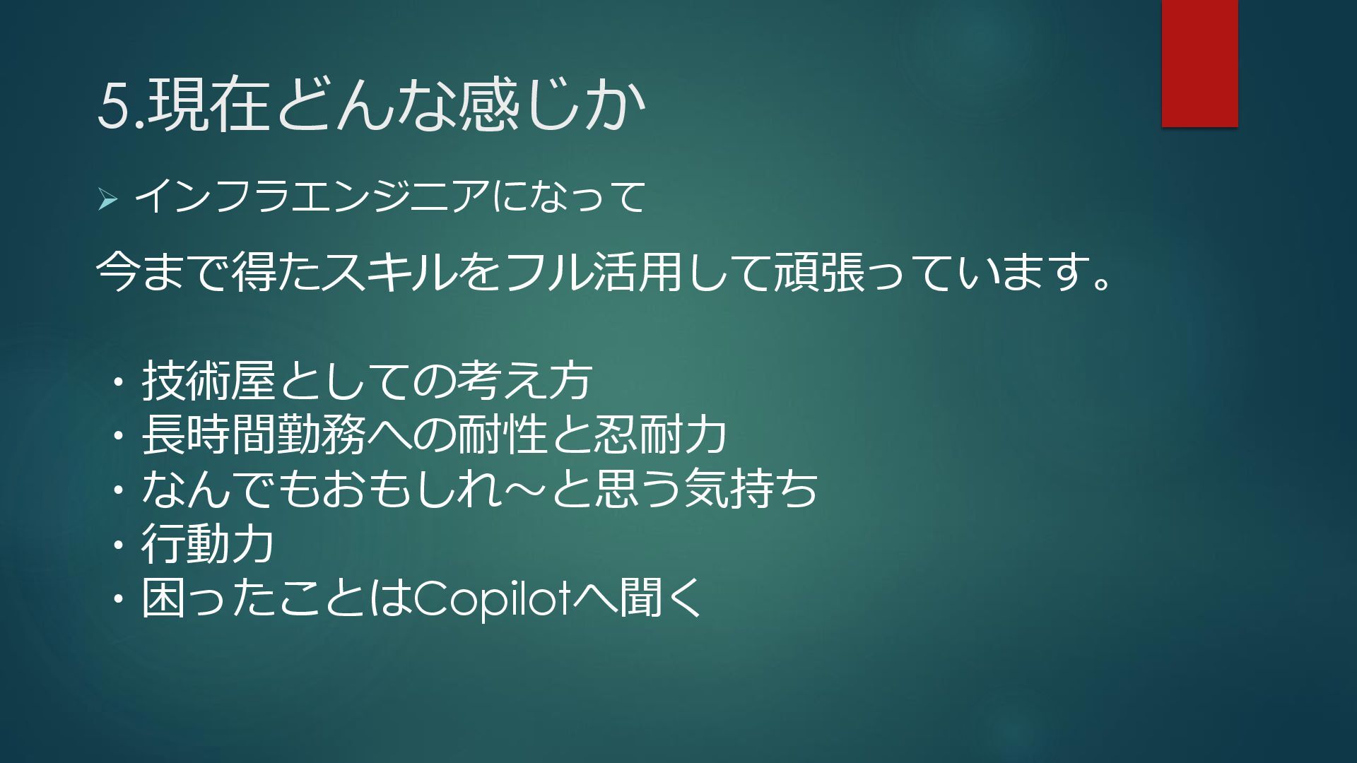 5.現在どんな感じか ➢ インフラエンジニアになって 今まで得たスキルをフル活用して頑張っています。 ・技術屋としての考え方 ・長時間勤務への耐性と忍耐力 ・なんでもおもしれ~と思う気持ち ・行動力 ・困ったことはCopilotへ聞く