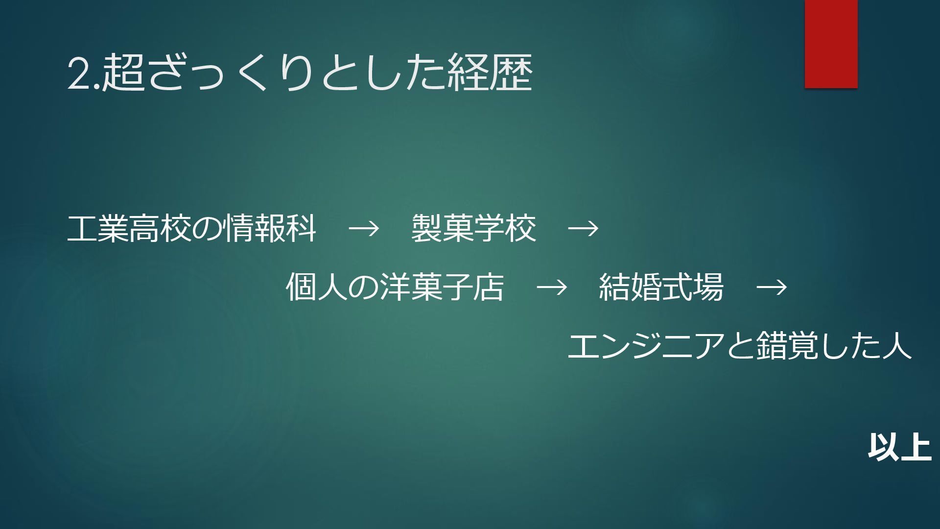 2.超ざっくりとした経歴 工業高校の情報科 → 製菓学校 → 個人の洋菓子店 → 結婚式場 → エンジニアと錯覚した人