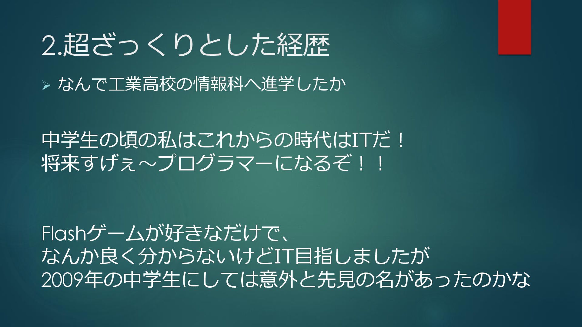 2.超ざっくりとした経歴 ➢ なんで工業高校の情報科へ進学したか 中学生の頃の私はこれからの時代はITだ! 将来すげぇ~プログラマーになるぞ!! Flashゲームが好きなだけで、 なんか良く分からないけどIT目指しましたが 2009年の中学生にしては意外と先見の名があったのかな
