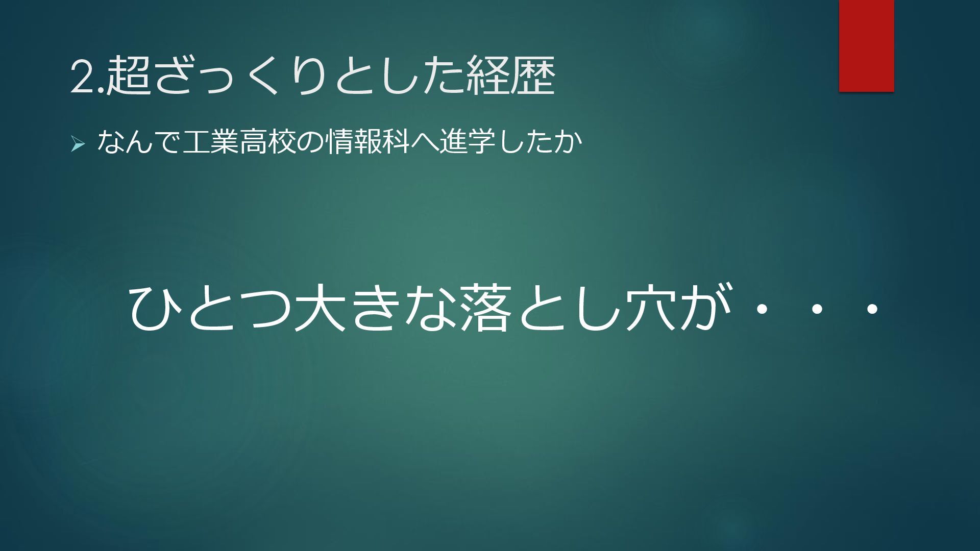 2.超ざっくりとした経歴 ➢ なんで工業高校の情報科へ進学したか ひとつ大きな落とし穴が・・・