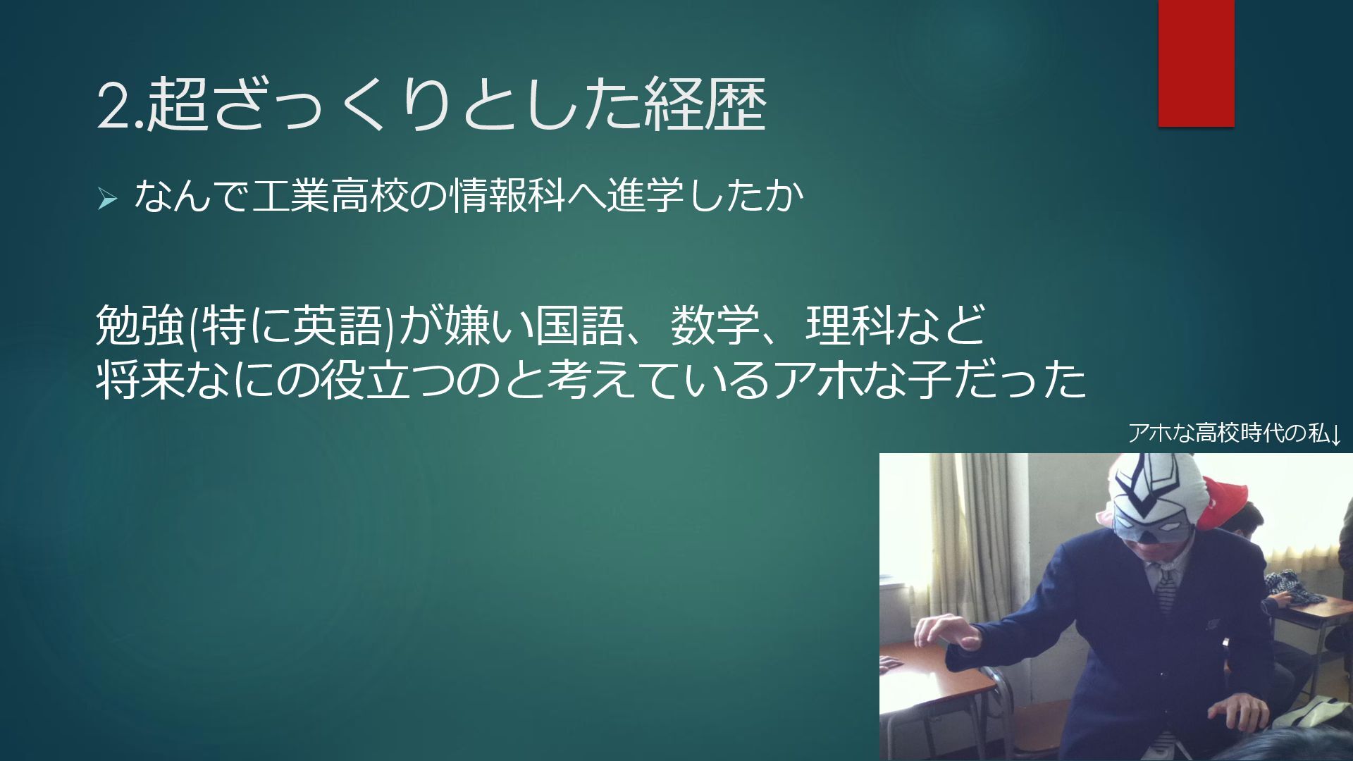 2.超ざっくりとした経歴 ➢ なんで工業高校の情報科へ進学したか 勉強(特に英語)が嫌い国語、数学、理科など 将来なにの役立つのと考えているアホな子だった アホな高校時代の私↓