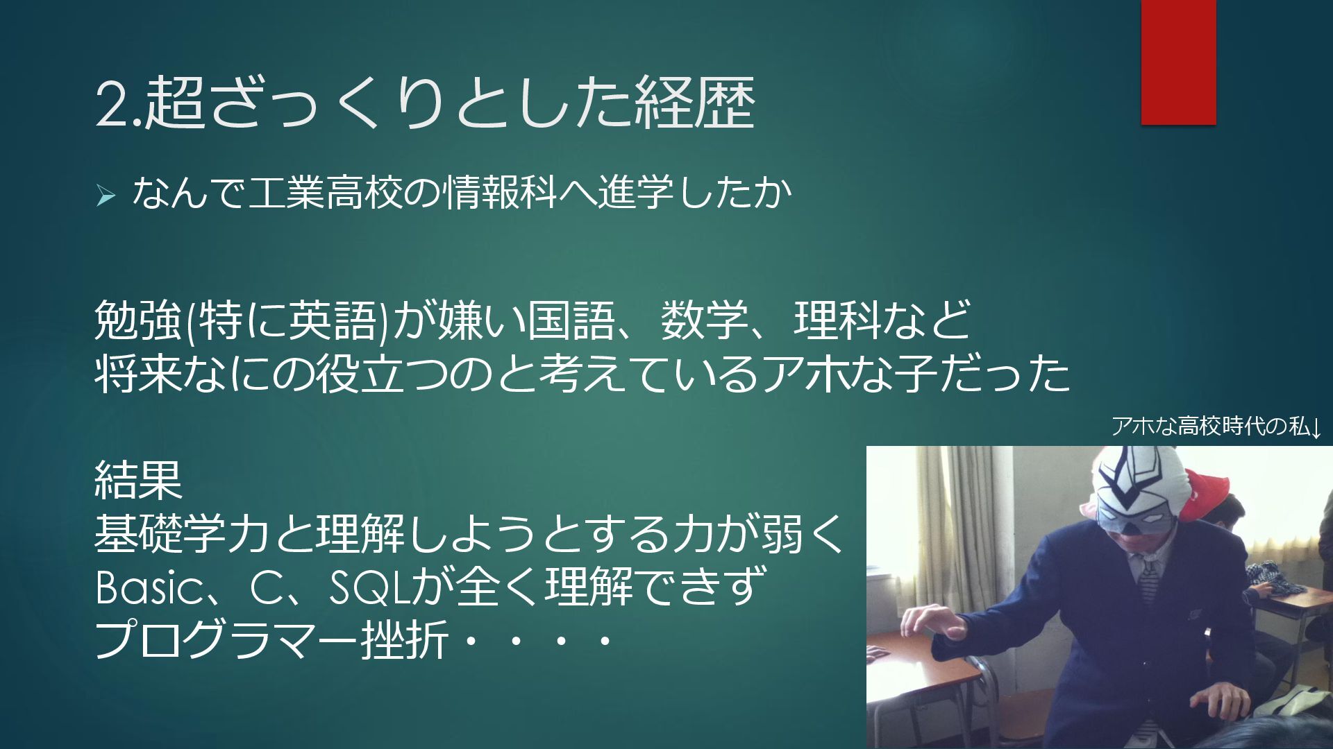 2.超ざっくりとした経歴 ➢ なんで工業高校の情報科へ進学したか 勉強(特に英語)が嫌い国語、数学、理科など 将来なにの役立つのと考えているアホな子だった 結果 基礎学力と理解しようとする力が弱く Basic、C、SQLが全く理解できず プログラマー挫折・・・・ アホな高校時代の私↓