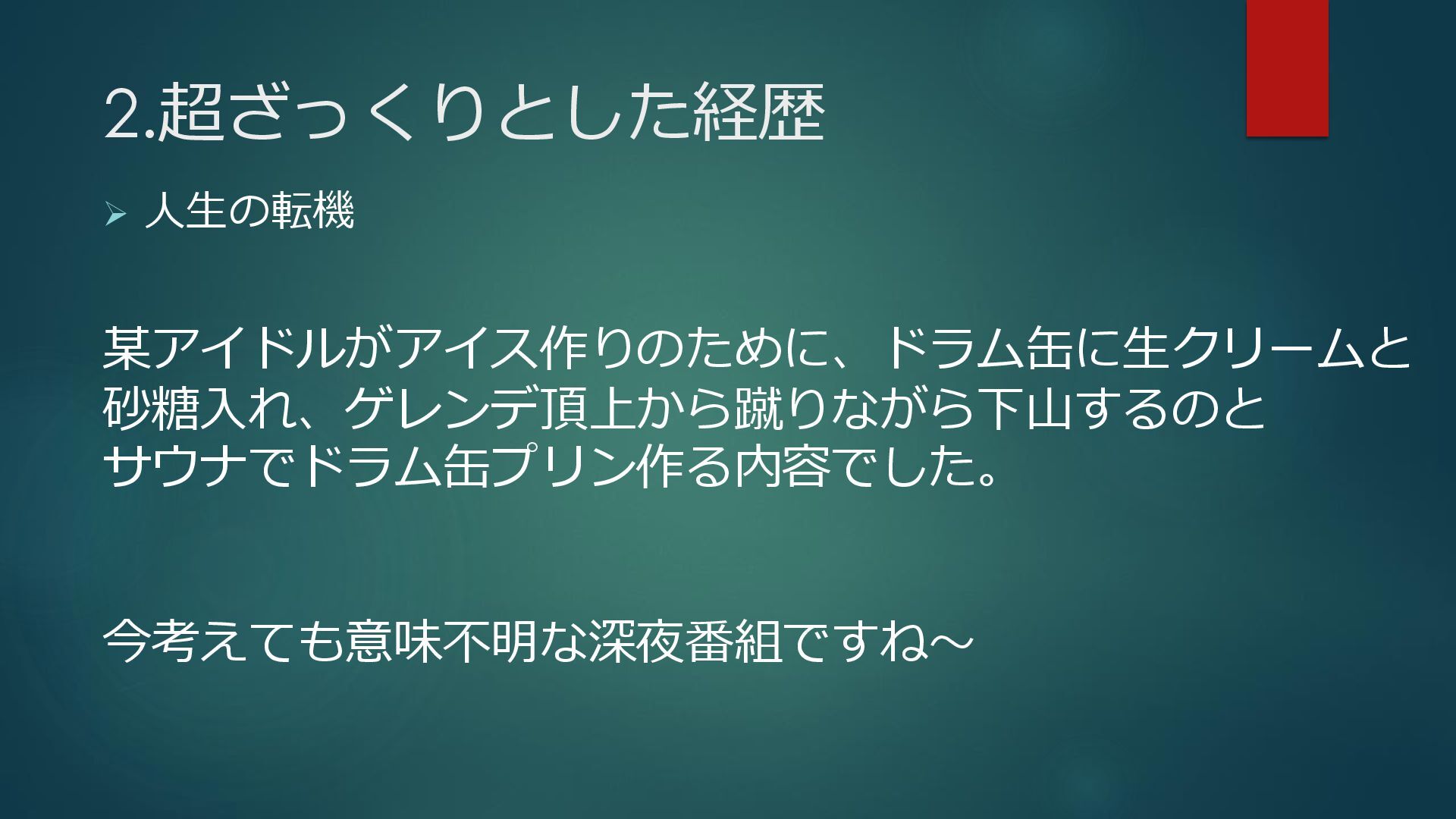 2.超ざっくりとした経歴 ➢ 人生の転機 某アイドルがアイス作りのために、ドラム缶に生クリームと 砂糖入れ、ゲレンデ頂上から蹴りながら下山するのと サウナでドラム缶プリン作る内容でした。 今考えても意味不明な深夜番組ですね~