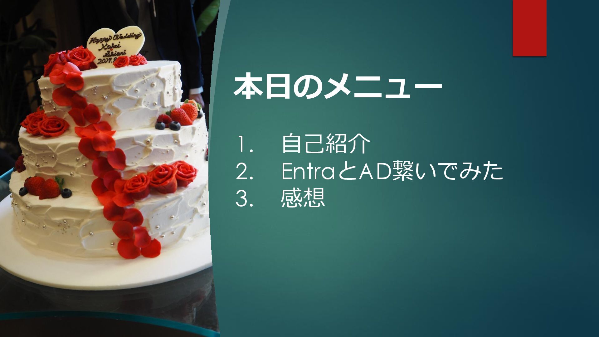 本日のメニュー 1. 自己紹介 2. EntraとAD繋いでみた 3. 感想