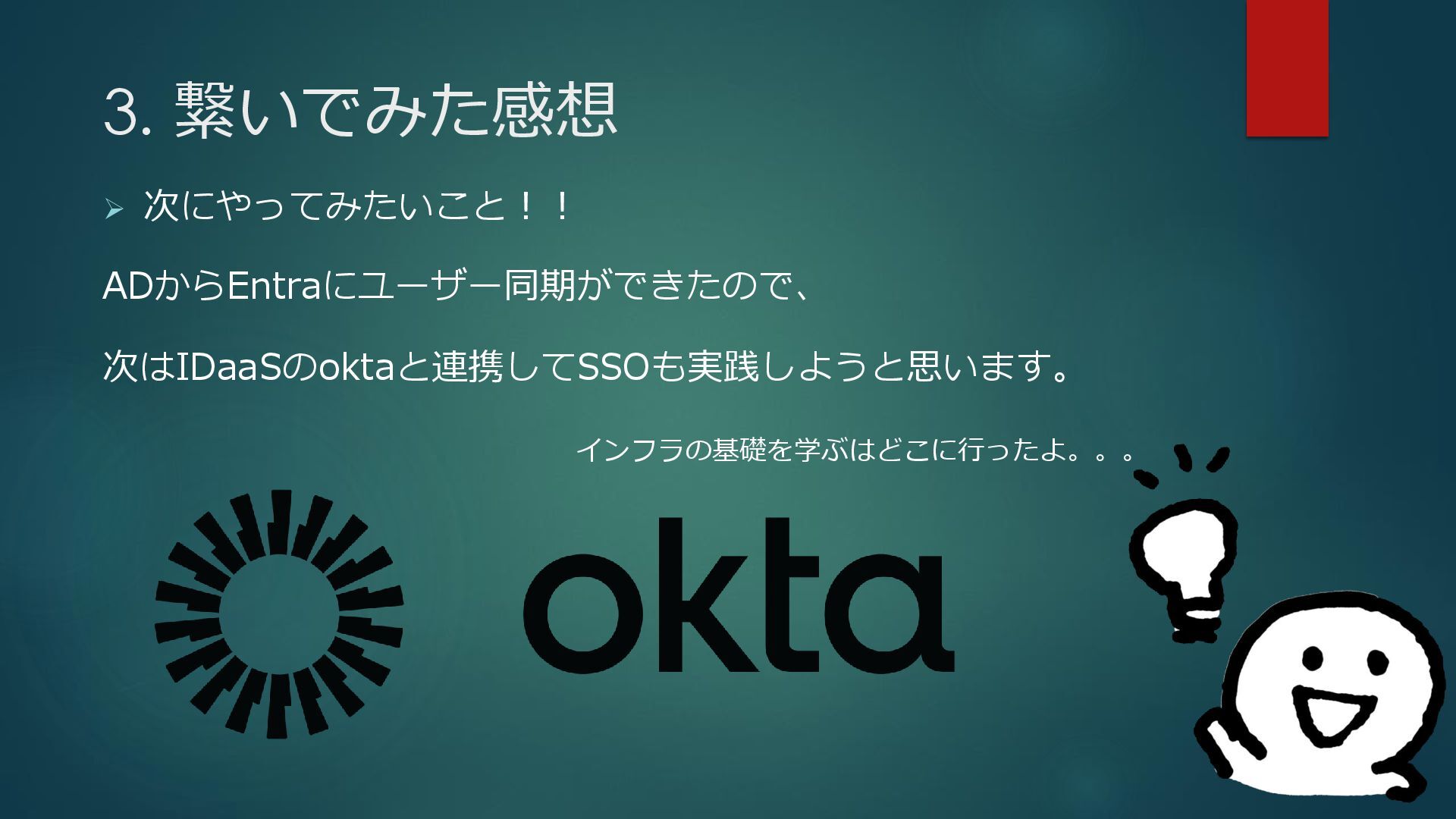 3. 繋いでみた感想 ➢ 次にやってみたいこと!! ADからEntraにユーザー同期ができたので、 次はIDaaSのoktaと連携してSSOも実践しようと思います。 インフラの基礎を学ぶはどこに行ったよ。。。
