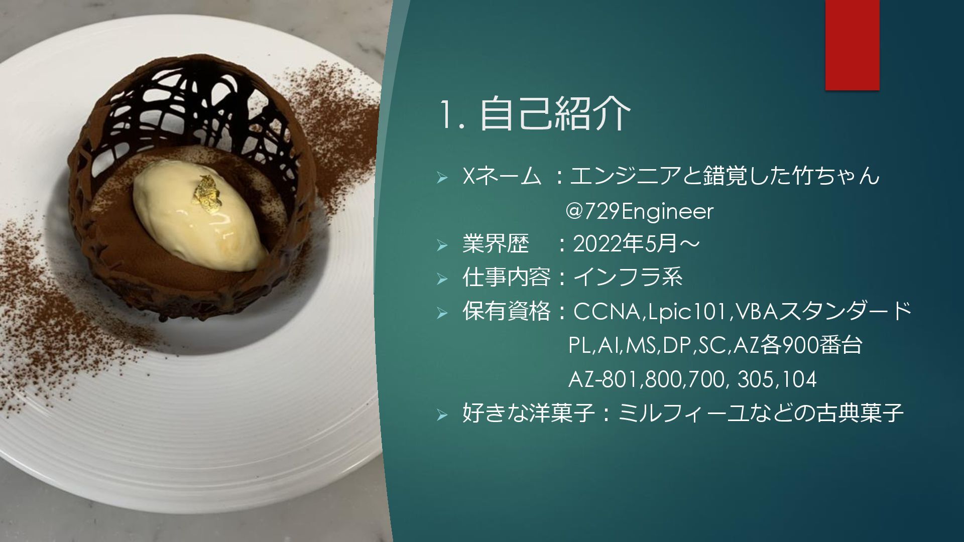 仕事内容:インフラ系 ➢ 保有資格:CCNA,Lpic101,VBAスタンダード PL,AI,MS,DP,SC,AZ各900番台 AZ-801,800,700, 305,104 ➢ 好きな洋菓子:ミルフィーユなどの古典菓子