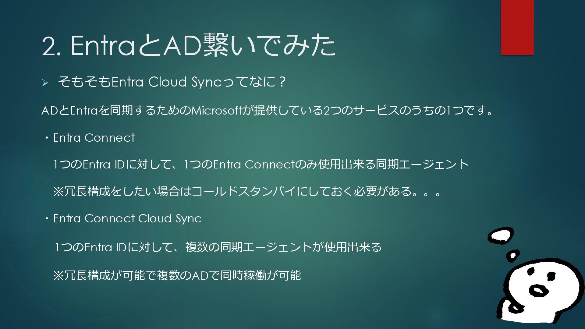 2. EntraとAD繋いでみた ➢ そもそもEntra Cloud Syncってなに? ADとEntraを同期するためのMicrosoftが提供している2つのサービスのうちの1つです。 ・Entra Connect 1つのEntra