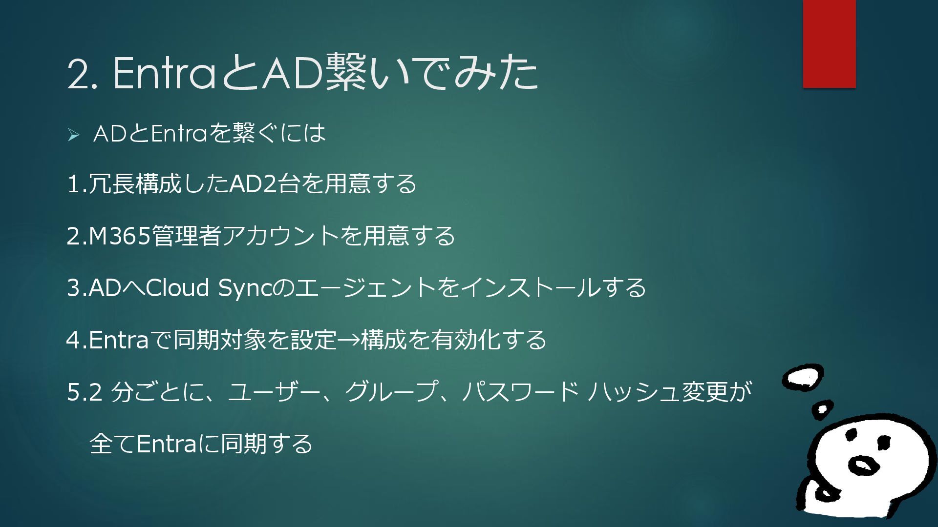 2. EntraとAD繋いでみた ➢ ADとEntraを繋ぐには 1.冗長構成したAD2台を用意する 2.M365管理者アカウントを用意する 3.ADへCloud Syncのエージェントをインストールする 4.Entraで同期対象を設定→構成を有効化する 5.2