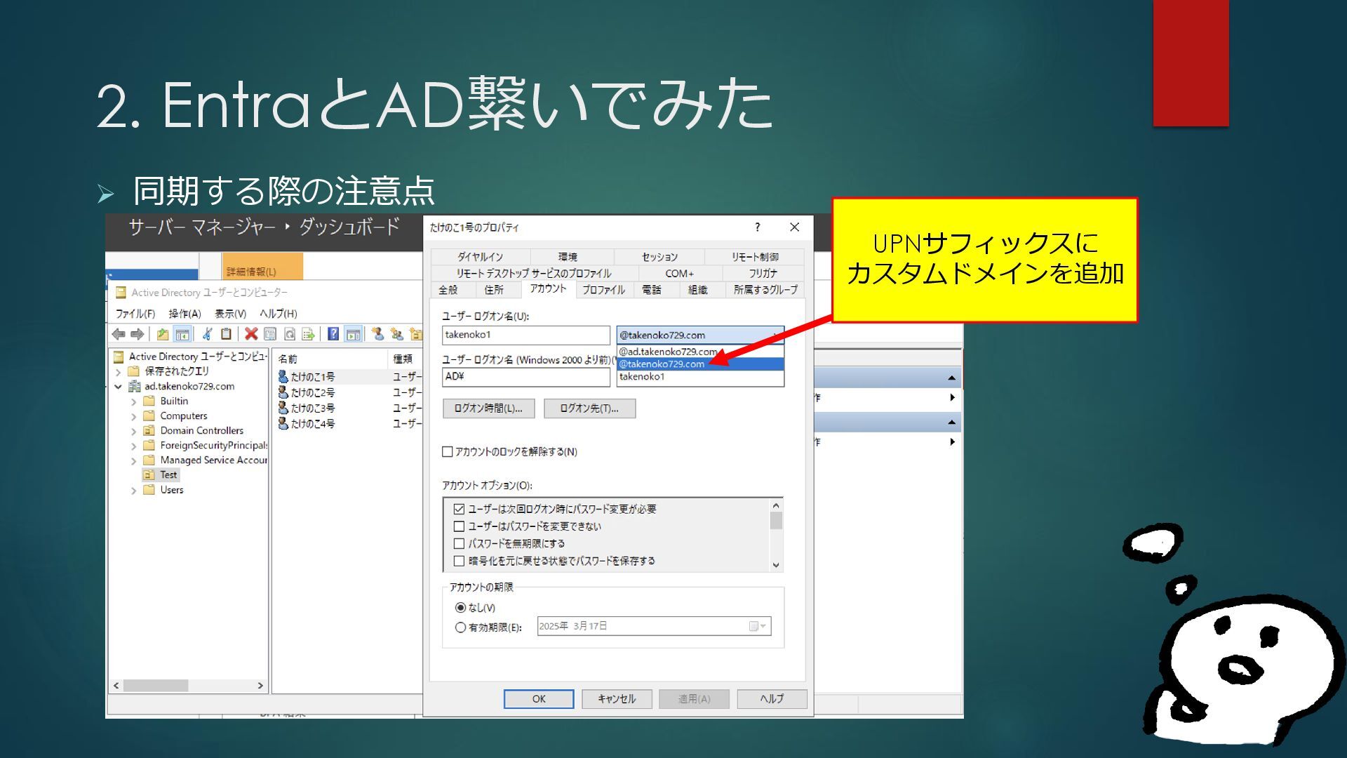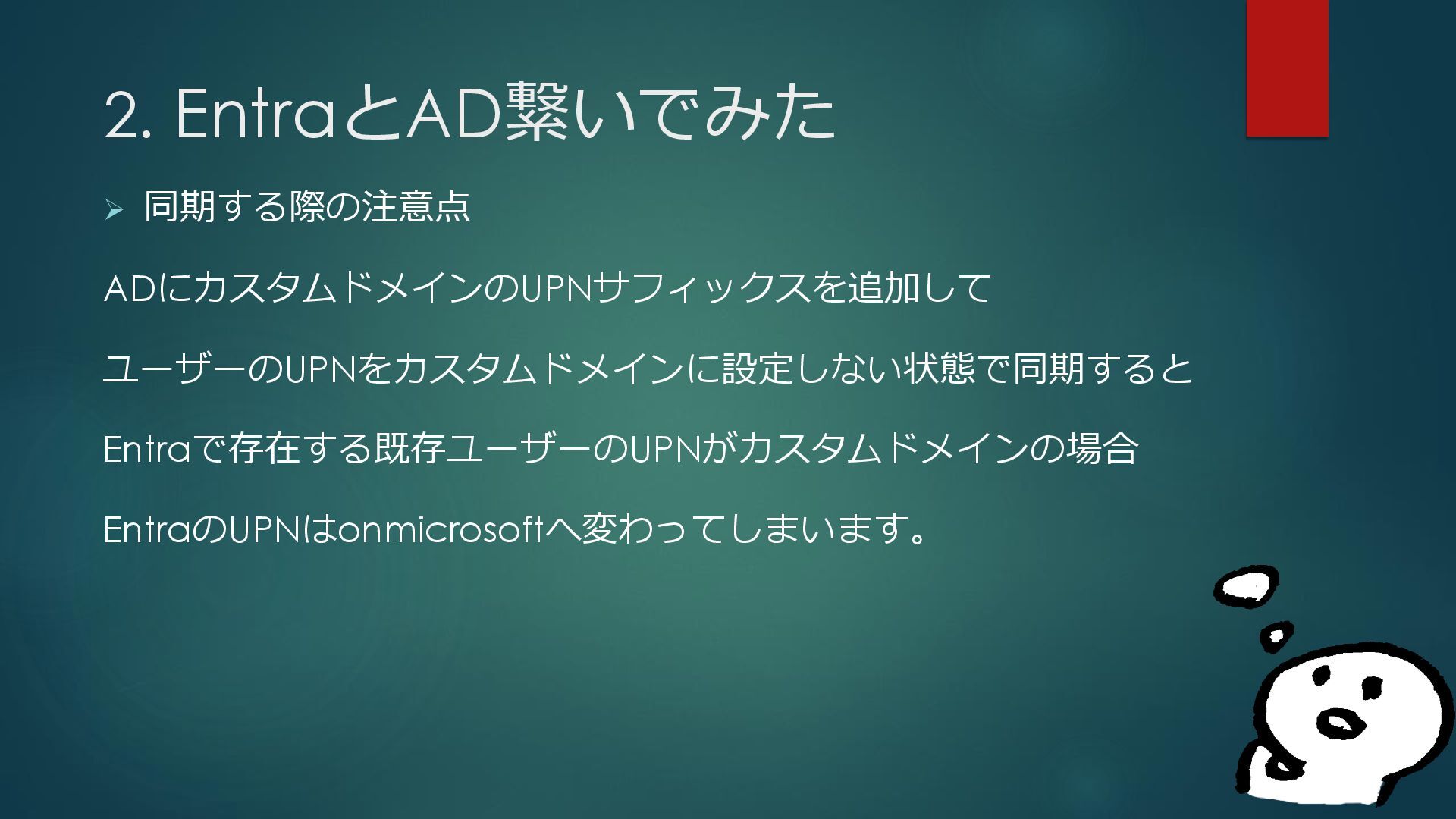 2. EntraとAD繋いでみた ➢ 同期する際の注意点 ADにカスタムドメインのUPNサフィックスを追加して ユーザーのUPNをカスタムドメインに設定しない状態で同期すると Entraで存在する既存ユーザーのUPNがカスタムドメインの場合 EntraのUPNはonmicrosoftへ変わってしまいます。