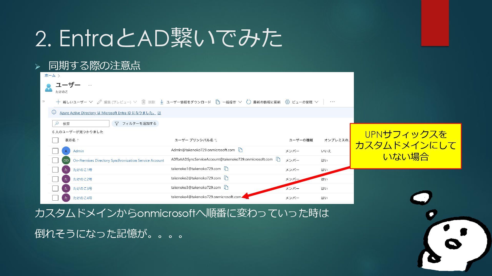 2. EntraとAD繋いでみた ➢ 同期する際の注意点 カスタムドメインからonmicrosoftへ順番に変わっていった時は 倒れそうになった記憶が。。。。 UPNサフィックスを カスタムドメインにして いない場合