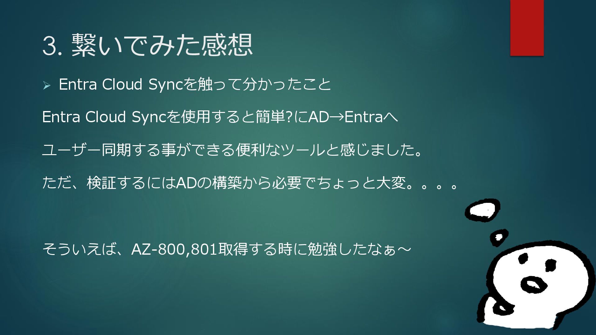 3. 繋いでみた感想 ➢ Entra Cloud Syncを触って分かったこと Entra Cloud Syncを使用すると簡単?にAD→Entraへ ユーザー同期する事ができる便利なツールと感じました。