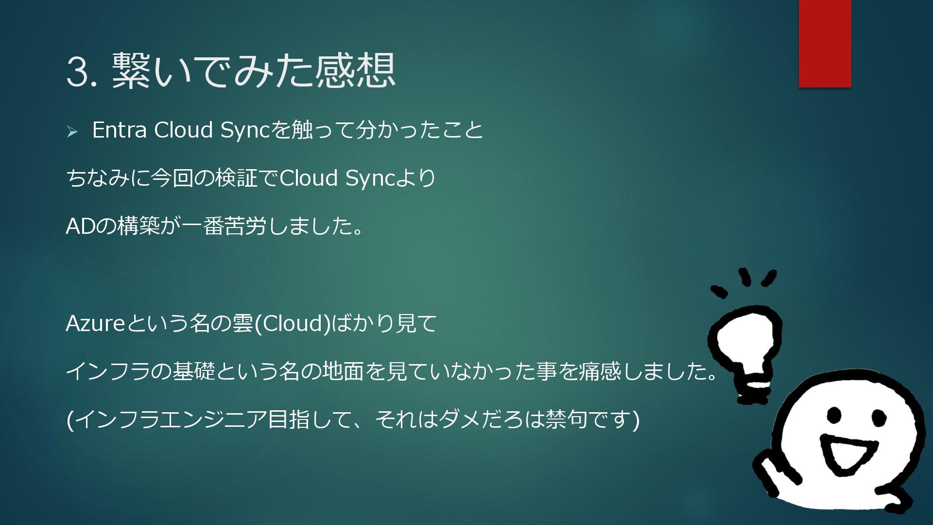 3. 繋いでみた感想 ➢ Entra Cloud Syncを触って分かったこと ちなみに今回の検証でCloud Syncより ADの構築が一番苦労しました。 Azureという名の雲(Cloud)ばかり見て