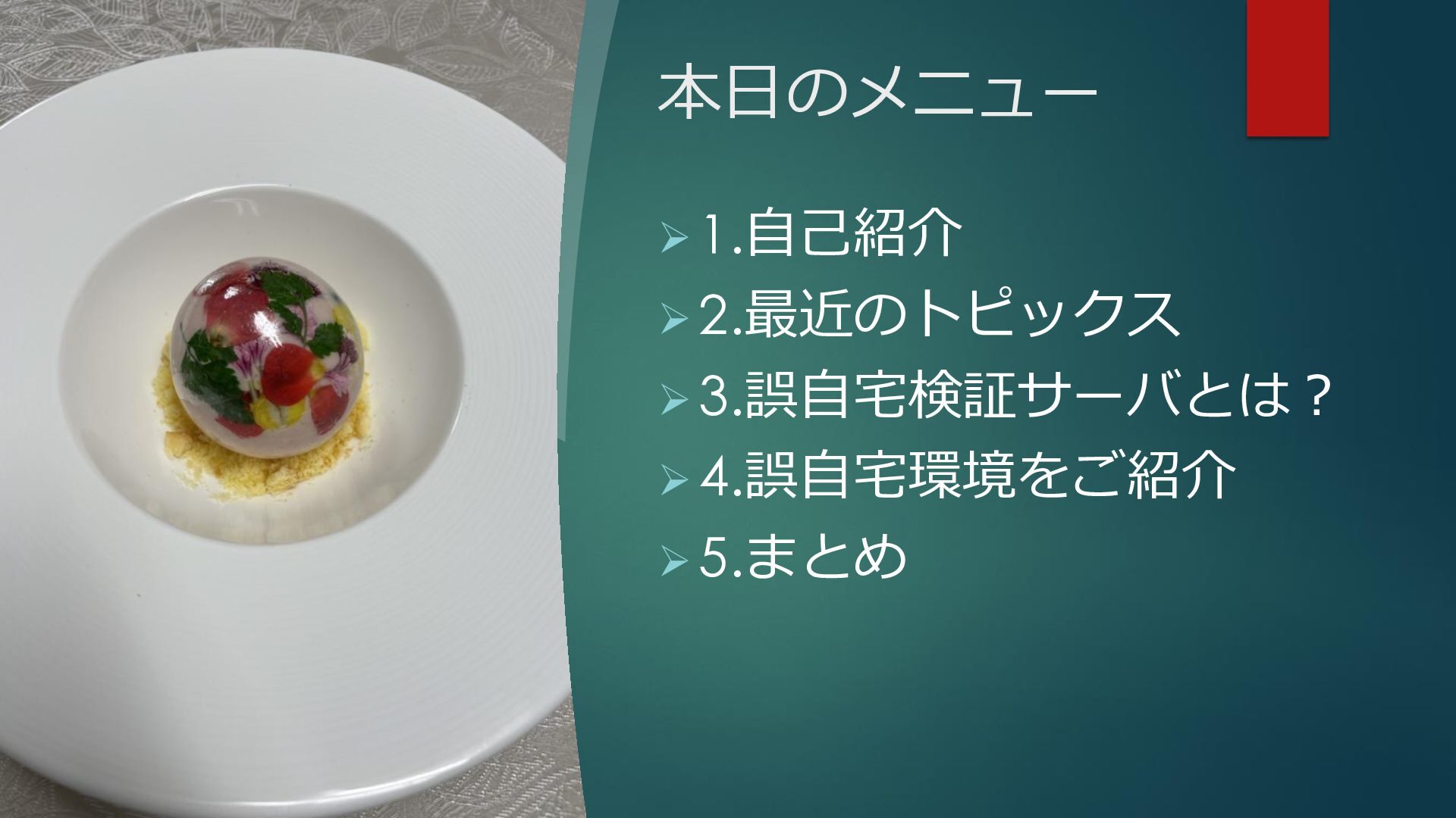 本日のメニュー ➢1.自己紹介 ➢2.最近のトピックス ➢3.誤自宅検証サーバとは? ➢4.誤自宅環境をご紹介 ➢5.まとめ