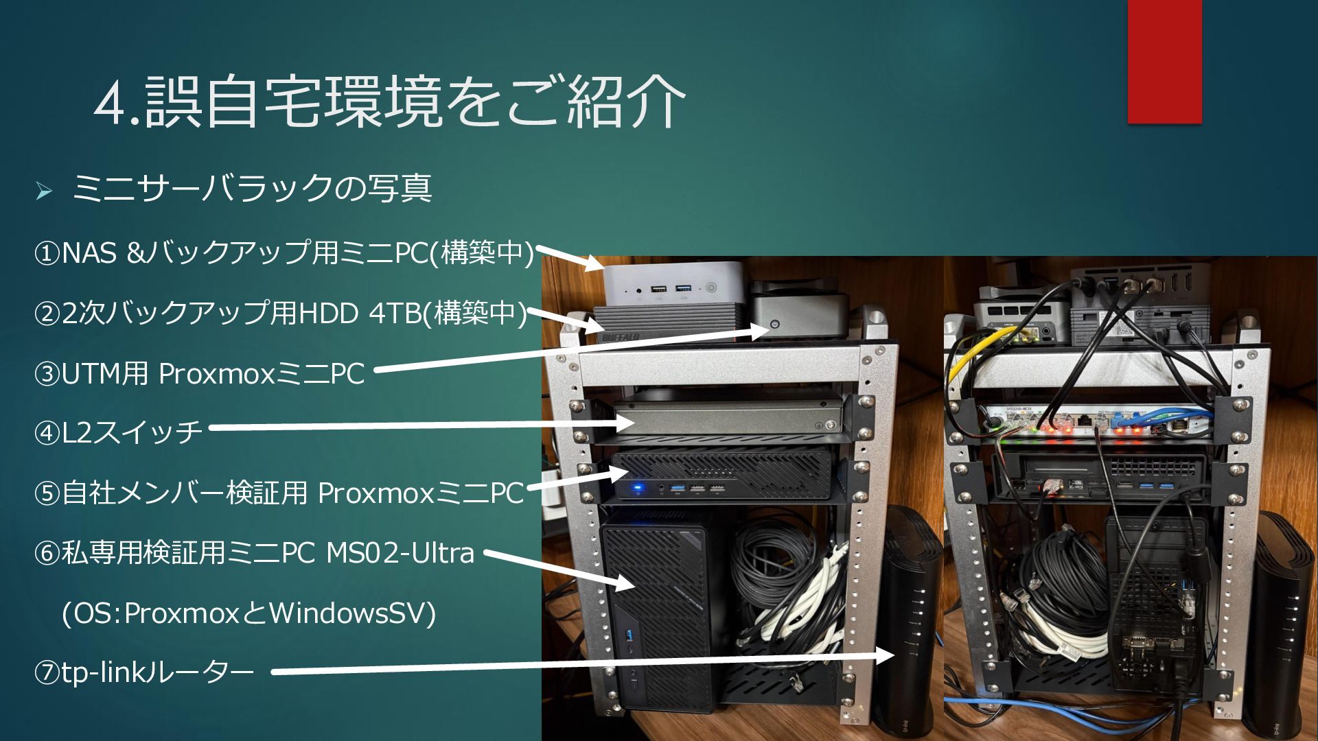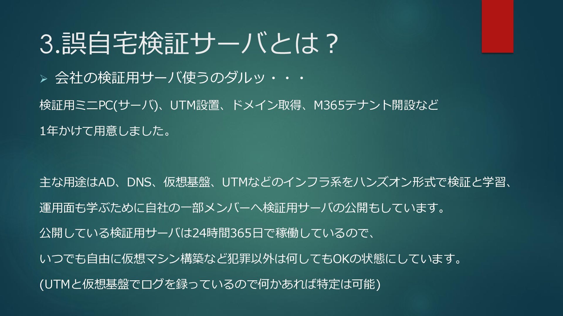 3.誤自宅検証サーバとは? ➢ 会社の検証用サーバ使うのダルッ・・・ 検証用ミニPC(サーバ)、UTM設置、ドメイン取得、M365テナント開設など 1年かけて用意しました。 主な用途はAD、DNS、仮想基盤、UTMなどのインフラ系をハンズオン形式で検証と学習、 運用面も学ぶために自社の一部メンバーへ検証用サーバの公開もしています。 公開している検証用サーバは24時間365日で稼働しているので、 いつでも自由に仮想マシン構築など犯罪以外は何してもOKの状態にしています。 (UTMと仮想基盤でログを録っているので何かあれば特定は可能)