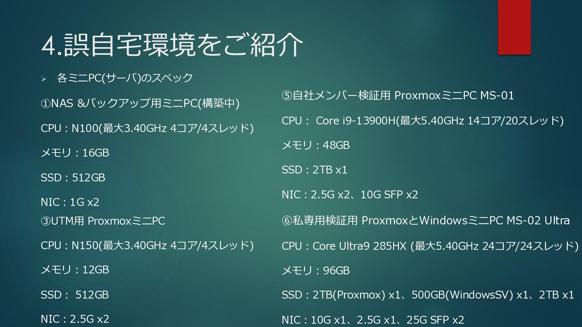 x2 ③UTM用 ProxmoxミニPC CPU:N150(最大3.40GHz 4コア/4スレッド) メモリ:12GB SSD: 512GB NIC:2.5G x2 ⑥私専用検証用 ProxmoxとWindowsミニPC MS-02 Ultra CPU:Core Ultra9 285HX (最大5.40GHz 24コア/24スレッド) メモリ:96GB SSD:2TB(Proxmox) x1、500GB(WindowsSV) x1、2TB x1 NIC:10G x1、2.5G x1、25G SFP x2 ⑤自社メンバー検証用 ProxmoxミニPC MS-01 CPU: Core i9-13900H(最大5.40GHz 14コア/20スレッド) メモリ:48GB SSD:2TB x1 NIC:2.5G x2、10G SFP x2