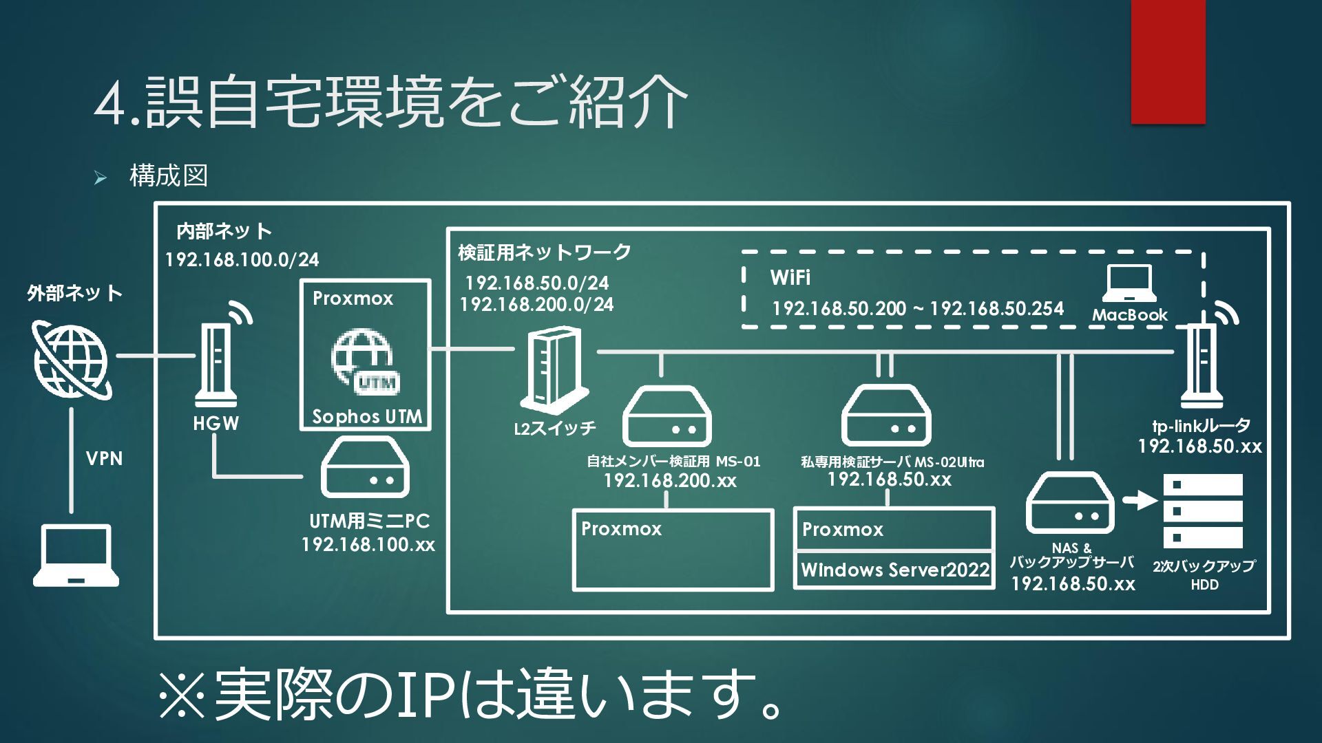 192.168.100.0/24 192.168.50.0/24 192.168.200.0/24 検証用ネットワーク L2スイッチ tp-linkルータ WiFi 192.168.50.200 ~ 192.168.50.254 NAS & バックアップサーバ 2次バックアップ HDD 192.168.50.xx 私専用検証サーバ MS-02Ultra 192.168.50.xx Proxmox Windows Server2022 自社メンバー検証用 MS-01 192.168.200.xx Proxmox MacBook ※実際のIPは違います。 VPN 192.168.50.xx 192.168.100.xx