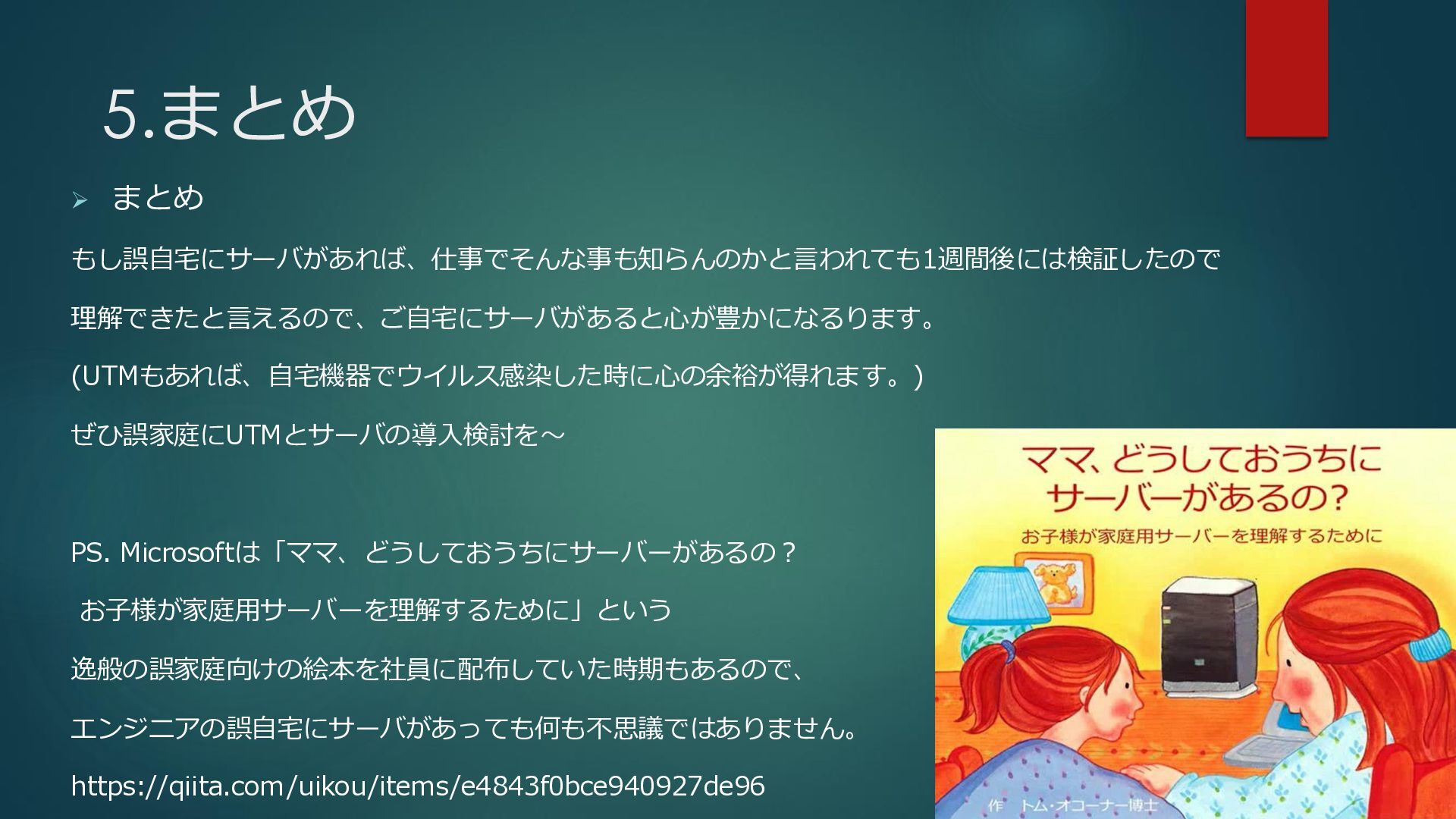 5.まとめ ➢ まとめ もし誤自宅にサーバがあれば、仕事でそんな事も知らんのかと言われても1週間後には検証したので 理解できたと言えるので、ご自宅にサーバがあると心が豊かになるります。 (UTMもあれば、自宅機器でウイルス感染した時に心の余裕が得れます。) ぜひ誤家庭にUTMとサーバの導入検討を〜 PS. Microsoftは「ママ、どうしておうちにサーバーがあるの? お子様が家庭用サーバーを理解するために」という