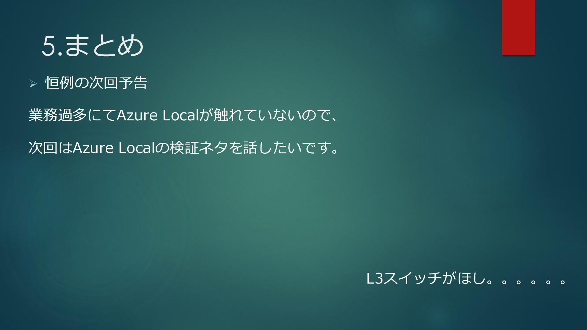 5.まとめ ➢ 恒例の次回予告 業務過多にてAzure Localが触れていないので、 次回はAzure Localの検証ネタを話したいです。 L3スイッチがほし。。。。。。