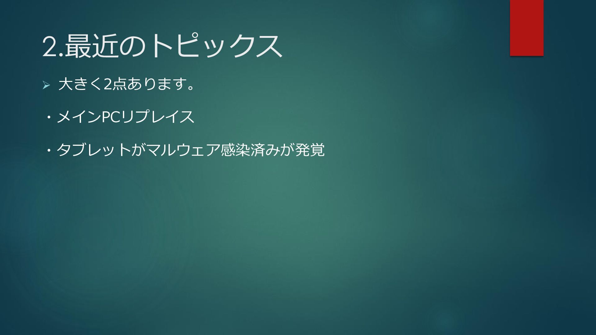 2.最近のトピックス ➢ 大きく2点あります。 ・メインPCリプレイス ・タブレットがマルウェア感染済みが発覚