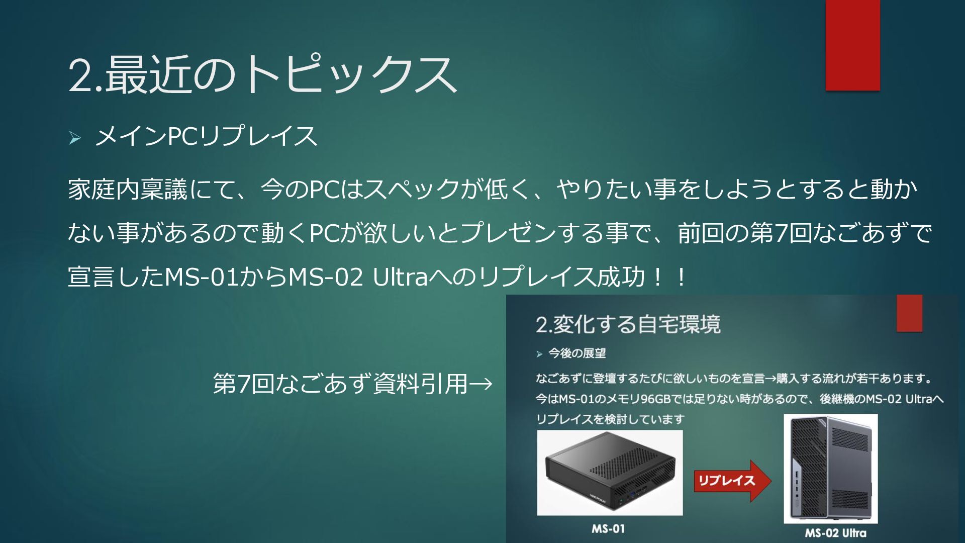 2.最近のトピックス ➢ メインPCリプレイス 家庭内稟議にて、今のPCはスペックが低く、やりたい事をしようとすると動か ない事があるので動くPCが欲しいとプレゼンする事で、前回の第7回なごあずで 宣言したMS-01からMS-02 Ultraへのリプレイス成功!! 第7回なごあず資料引用→