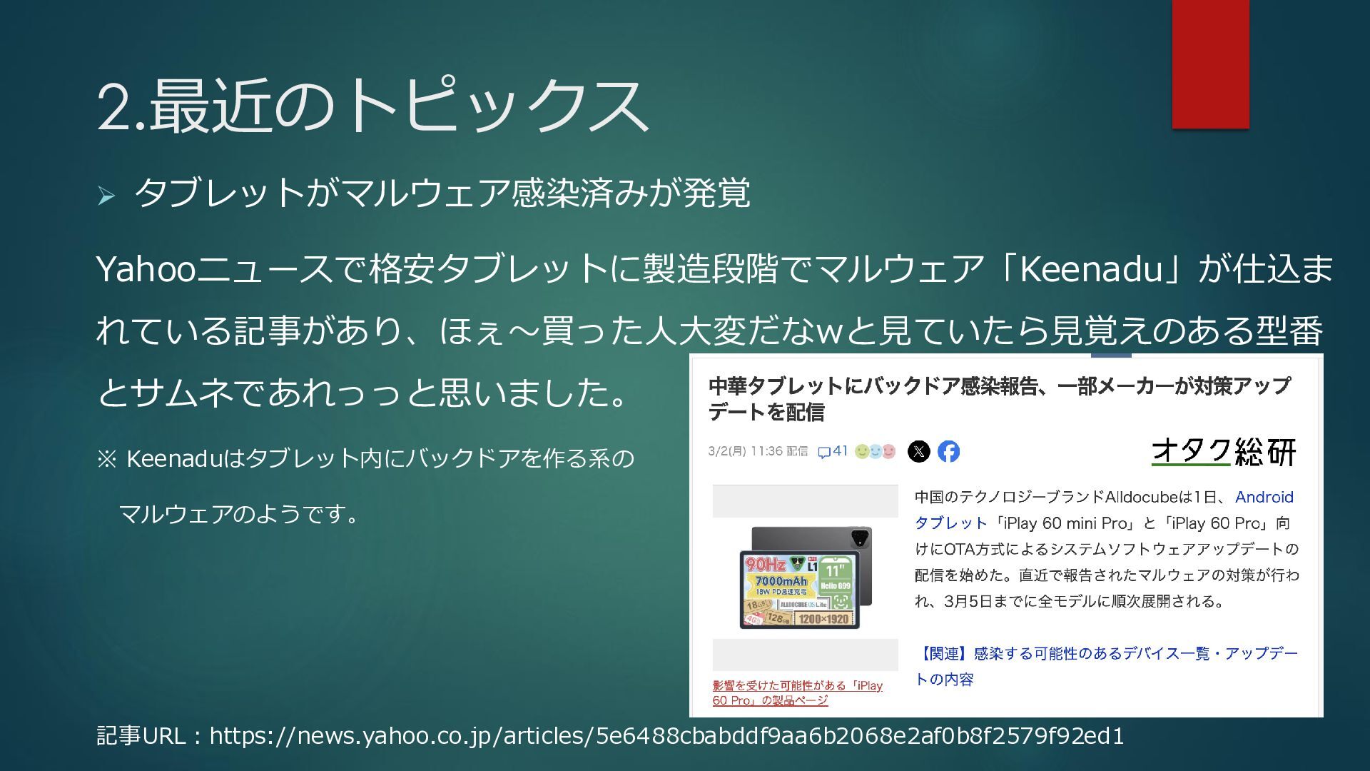 2.最近のトピックス ➢ タブレットがマルウェア感染済みが発覚 Yahooニュースで格安タブレットに製造段階でマルウェア「Keenadu」が仕込ま れている記事があり、ほぇ〜買った人大変だなwと見ていたら見覚えのある型番 とサムネであれっっと思いました。 ※ Keenaduはタブレット内にバックドアを作る系の マルウェアのようです。 記事URL:https://news.yahoo.co.jp/articles/5e6488cbabddf9aa6b2068e2af0b8f2579f92ed1