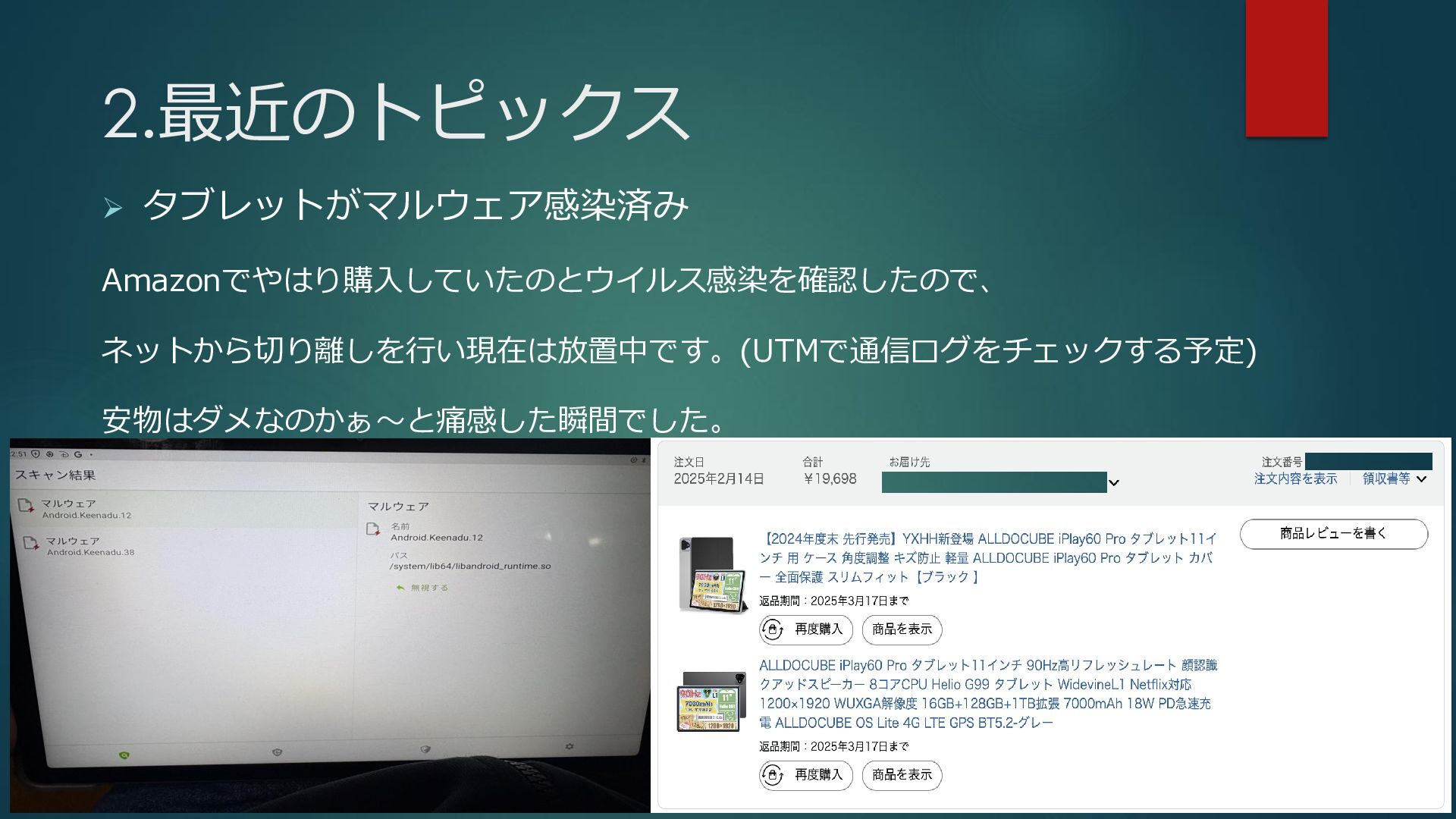 2.最近のトピックス ➢ タブレットがマルウェア感染済み Amazonでやはり購入していたのとウイルス感染を確認したので、 ネットから切り離しを行い現在は放置中です。(UTMで通信ログをチェックする予定) 安物はダメなのかぁ〜と痛感した瞬間でした。