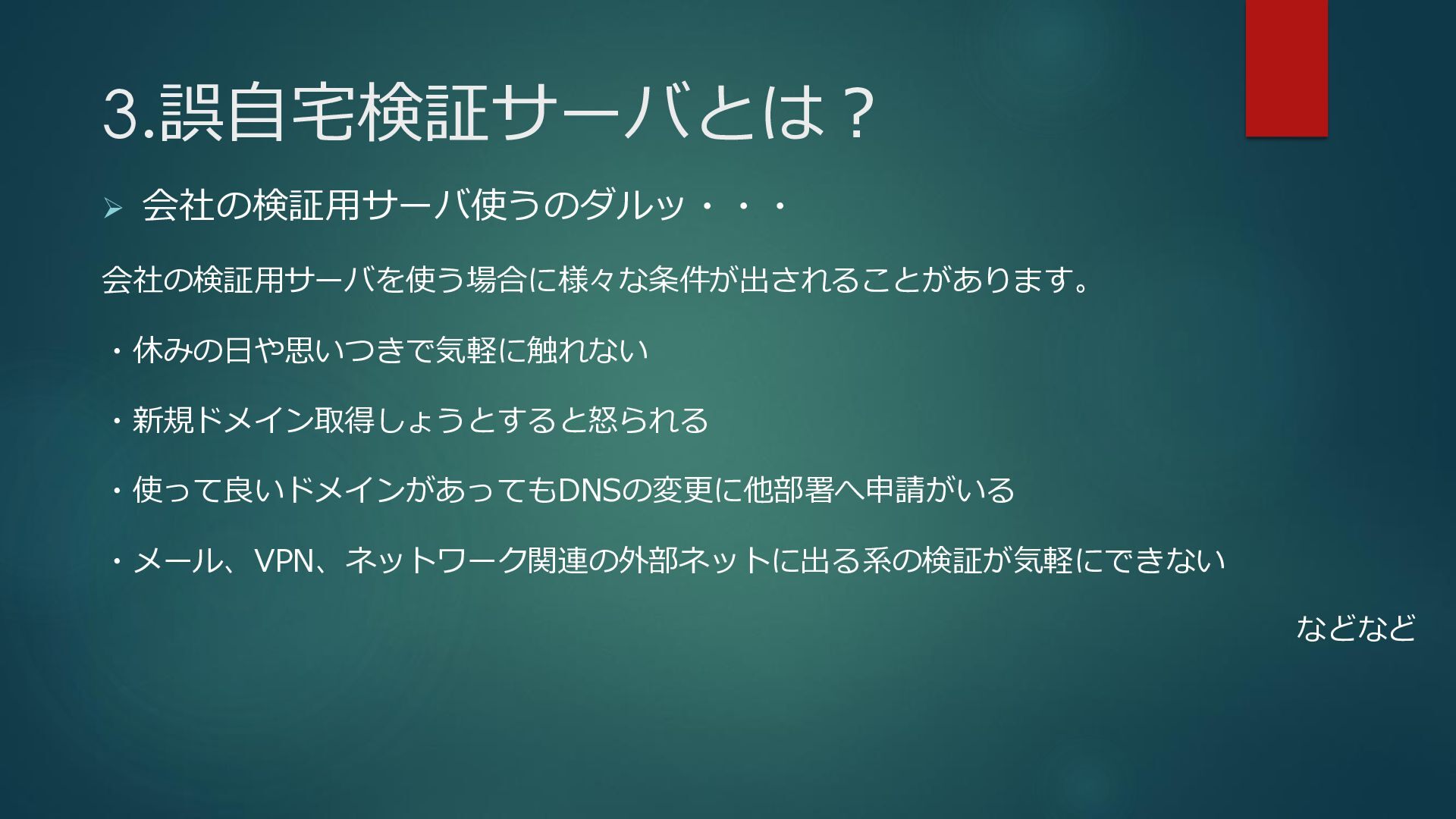 3.誤自宅検証サーバとは? ➢ 会社の検証用サーバ使うのダルッ・・・ 会社の検証用サーバを使う場合に様々な条件が出されることがあります。 ・休みの日や思いつきで気軽に触れない ・新規ドメイン取得しょうとすると怒られる ・使って良いドメインがあってもDNSの変更に他部署へ申請がいる ・メール、VPN、ネットワーク関連の外部ネットに出る系の検証が気軽にできない などなど