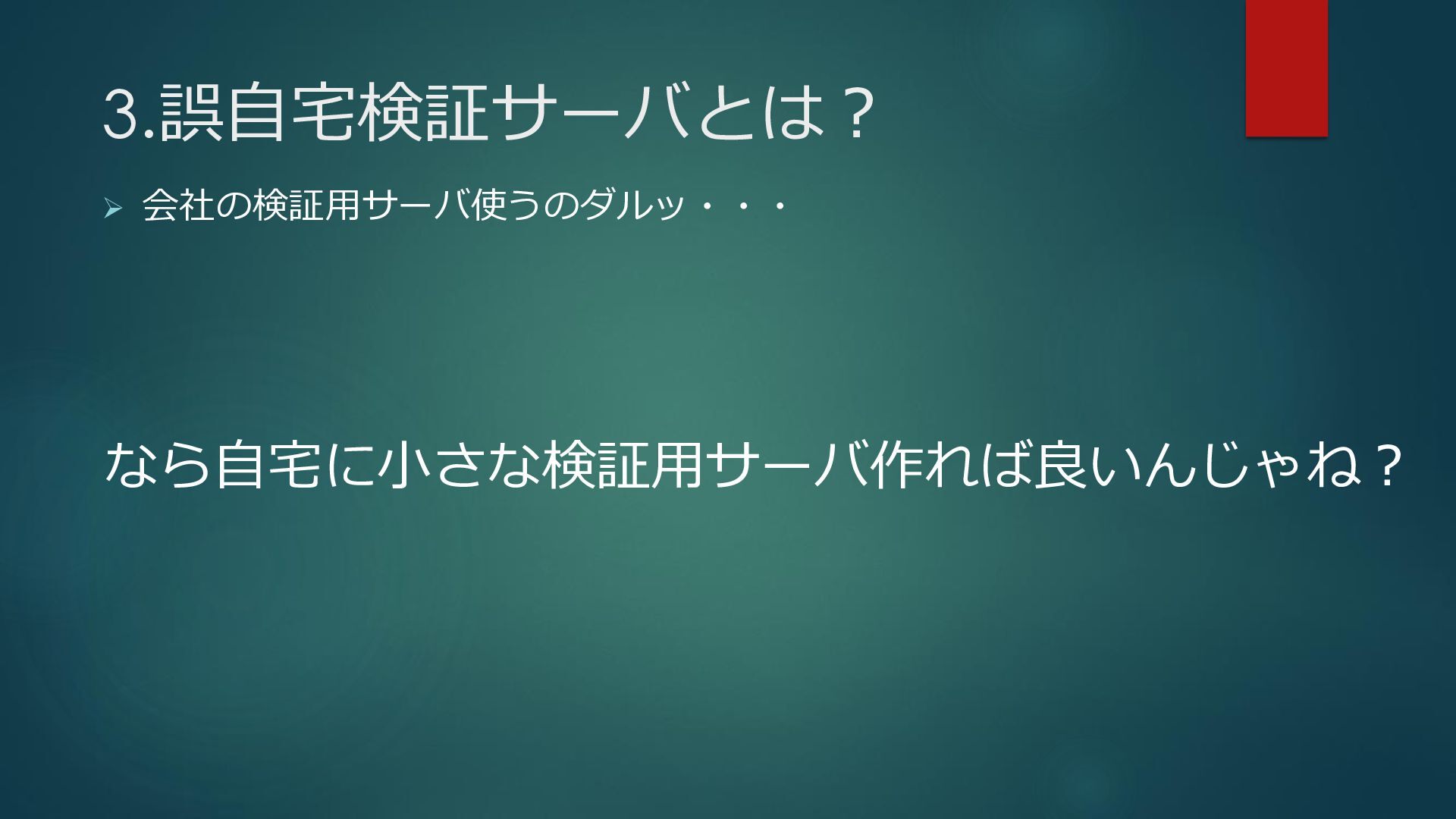 3.誤自宅検証サーバとは? ➢ 会社の検証用サーバ使うのダルッ・・・ なら自宅に小さな検証用サーバ作れば良いんじゃね?