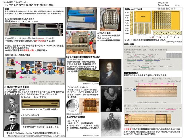 • この対数表を作るために一つ一つの 数字を計算していく必要がある • 当然,初期の対数表には計算ミスや 人為ミスによる間違いが混入し,トラブ ルの元になっていた. • 安全な航行のためには 船の現在位置の算出が 必要 • 計算の誤差がそのまま 位置の誤差になり航海の 成否を左右する.そのた め高い桁数で精度良く計 算したい • 対数はこの計算を容易に するために開発された チャールズ・バベッジ 1791年12月26日 - 1871年10月18日 イギリスの数学者,哲学者、計算機科学者 • 対数表に人為的な誤りが多いことから, 機械式計算機に動力を繋いだ機械で自 動計算させることを考案(階差機関) • 世界初のプログラ ム機能付き計算 機のアイデアであ り,コンピュータの 祖と見る人もいる https://club.informatix.co.jp/?p=2660 計算機の発展の背景 • 計算が大幅な発達を遂げたのが16−17世紀 • この時期に「計算を頻繁に行う必要」があり,「大きな桁数の数字を 精度良く扱う必要」が出てきた • 大航海時代と,それに続く大交易時代,航海の成功が大きな富をも たらす 【余談】クロノグラフ • 船の現在位置(特に経度) 算出に正確な時計が必要 • 英・経度法が制定され揺 れる船の上でも正確に時 刻を測定できる時計開発 を奨励 • 英ジョン・ハリソンが1760 年,世界初のクロノグラフ を開発 計算は儲かる! • この時代,保険制度が発達 • 交易が成功すれば引受人(出資者)はその利益の配分を受け, もし失敗すれば引受人がその損失を補填する • 航海術だけではなく交易の成功率の計算などでも計算が活用さ れ,計算に対する出資が進む. • その権利の債権化などを通じて金融が発達.金融工学という学 問分野も生まれる 現在も金融・保険業界はスーパーコンピューターや量子コンピュー ティングへの投資に熱心 ”In the financial markets, computing speed is a giant advantage. ” (金融市場において,計算速度は大きなアドバンテージである) https://www.goldmansachs.com/careers/blog/possibilities-quantum-computing/ 4.計算尺や機械式計算機の発展の先に 今日のようなコンピュータ社会があっただろうか? 電子計算機時代が来なければ情報化社会はなかったと考える. 機械式計算機 電子計算機 1011 1010 1011 1010 0001 1001 0111 1001 10進数 2進数 27 April. 2025 Takenori Baba • 人間が理解しやすいように10進数→2進数,2進数→10進数 に変換する仕組みが生まれる. • これは言い換えれば10進数の数字という情報を,2進数に結 びつけることができるということ. 符号化 • 本来数値ではない情報を、数値や2進数で表現すること.具体 的には、文字や画像、音声などをコンピュータが理解できる形 で変換するプロセスを指す. • 音などの信号や,画像,動画についても処理をすることで,2 進数のデータで表現できる • 2進法の数字に意味を割り付けることで,広い概念の情報を扱 うことができるようになり,今の高度情報社会につながった 画像はWikipediaより引用 画像はWikipediaより引用 5.符号化された情報社会の未来 符号の誤解釈の問題 機械学習 AI自身が,符号化された情報を自動的にある意味に紐付ける <懸念点> • 標準化のように厳密に意味を定義し紐づけたわけではなく,コン ピュータが自動的に紐付け,誤解釈が生まれる余地がある. • 言語においては一つの言葉が複数以上の意味を持つ可能性が 高い.どの意味を採用するかは話者の立場で変わる. 意味論(Semantics) 【結論】AIを使うにはAI以上に賢くなければならない • AIは非常に強力なツールであり「使わない」という選択肢はない • 計算機は人間の能力を補助するツール.AIもそうあるべきもの. • ツールには何らかの間違い(入力ミス,処理系の特性,誤解釈な ど)が入りうる.その間違いを認識するためにはこれらのツールの 処理を理解しておく必要がある. • AIにおいてはその処理が見えにくい.最近のAIでは判断の根拠文 書が示されることが多く,文書の原典を当たり,当該記述の正確 性・信頼性をしっかり確認することが大事 • それはAI同等,あるいはそれ以上に賢くなければいけないことに 他ならないのではないか? 2進数とそこに結びつける意味のルール作り(標準化など)を通じ, 誤解釈が生まれるのを防いできた. Johnson Space Centerのガイドさん(元アポロ計画技術者)の話 月面着陸をやり遂げたのはNASAの若造たちだ.ジーン・クランツも あの時32歳でしかない. お若いの,あんた今写真撮ってたと思うが,アポロ計画に使われた コンピュータの主記憶装置,その容量全部足してもその写真1枚を 収めることなんてできない.でも我々はそれを使って成し遂げたん だ.今はそれよりもっと良い技術が身近にある.なあ,君たちは技 術を使うのではなく.逆に技術に使われてはいないかい? Page.2