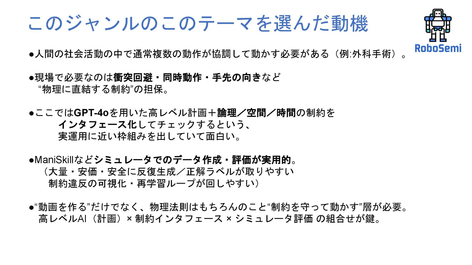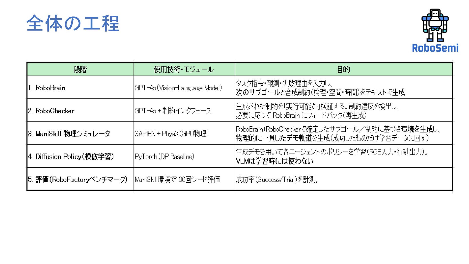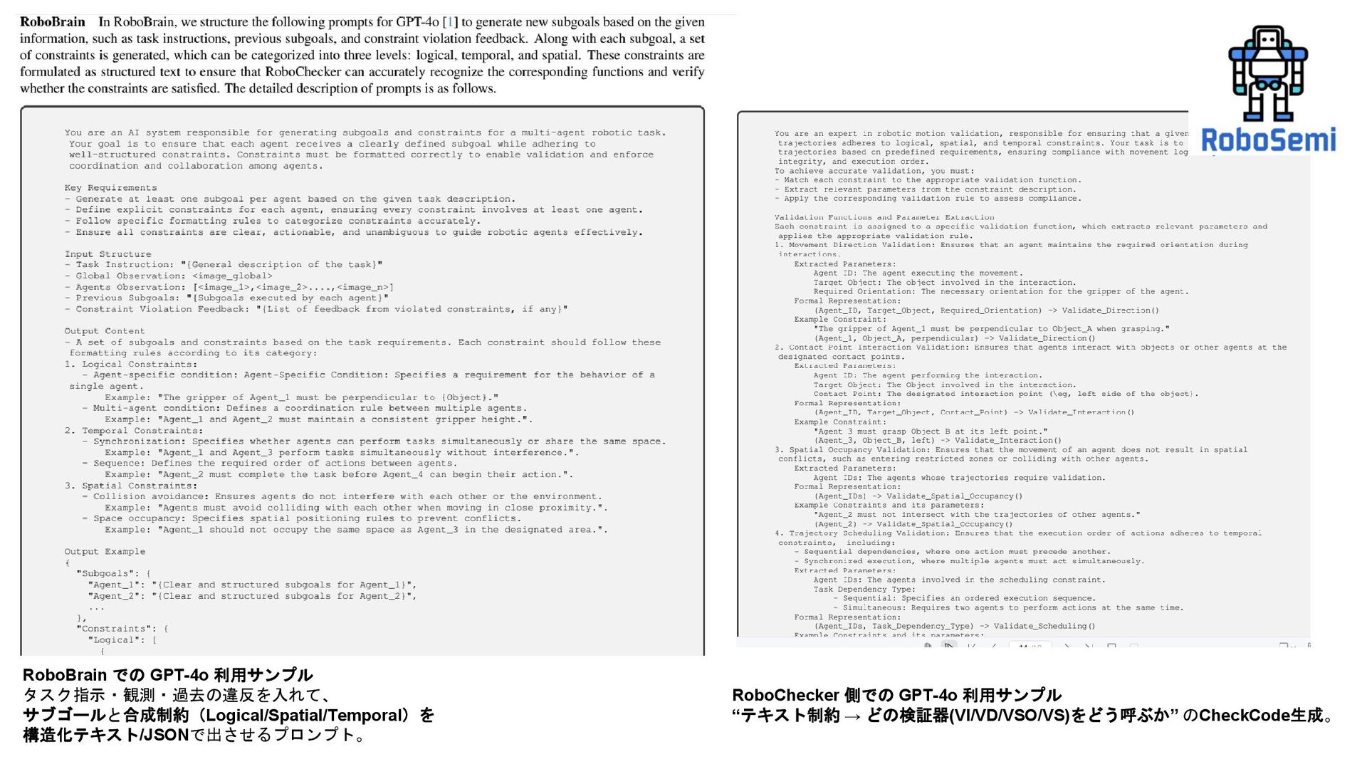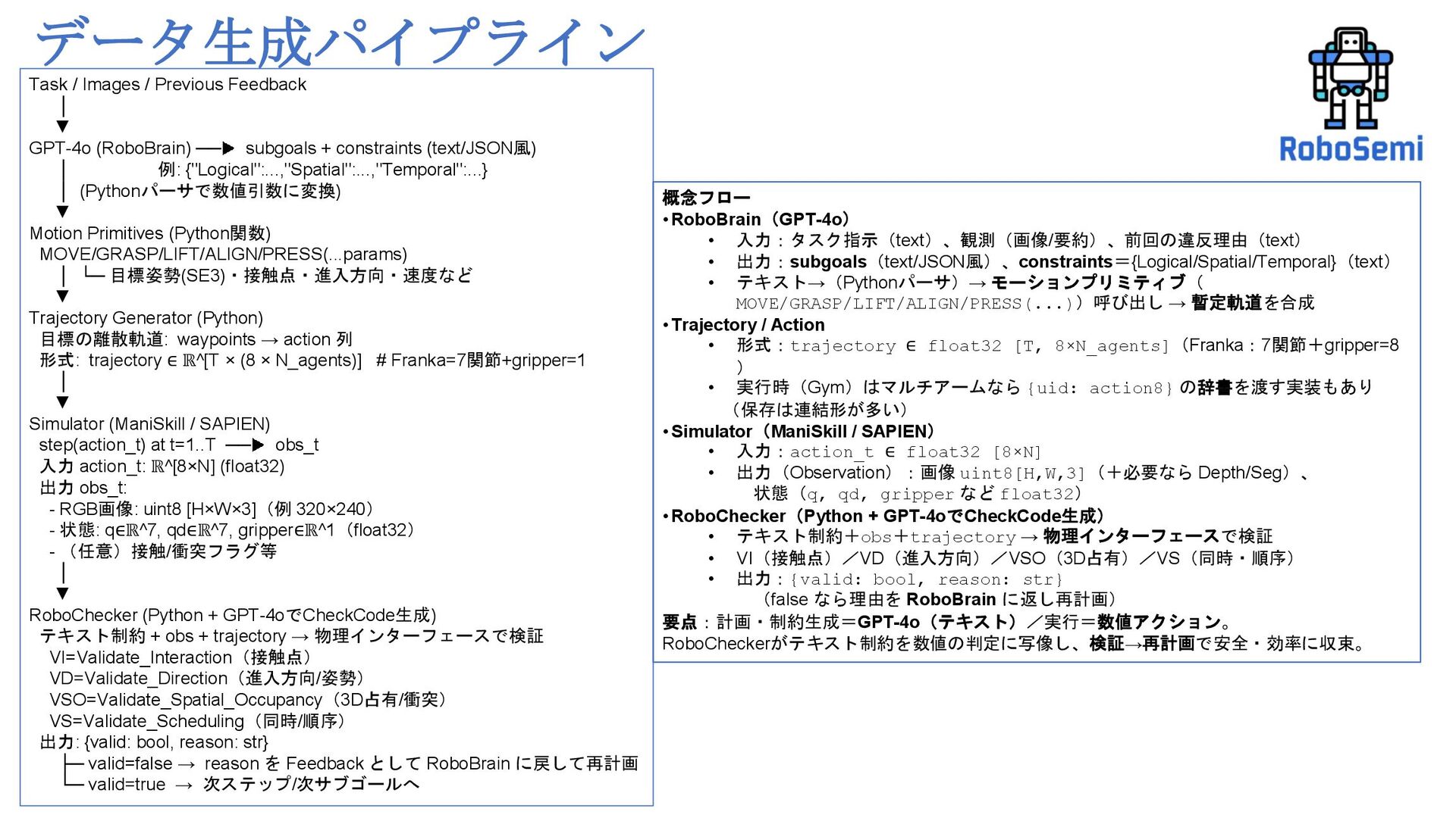 (RoboBrain) ── subgoals + constraints (text/JSON風) │ 例: {"Logical":...,"Spatial":...,"Temporal":...} │ (Pythonパーサで数値引数に変換) ▼ Motion Primitives (Python関数) MOVE/GRASP/LIFT/ALIGN/PRESS(...params) │ └─ 目標姿勢(SE3)・接触点・進入方向・速度など ▼ Trajectory Generator (Python) 目標の離散軌道: waypoints → action 列 形式: trajectory ∈ ℝ^[T × (8 × N_agents)] # Franka=7関節+gripper=1 │ ▼ Simulator (ManiSkill / SAPIEN) step(action_t) at t=1..T ── obs_t 入力 action_t: ℝ^[8×N] (float32) 出力 obs_t: - RGB画像: uint8 [H×W×3](例 320×240) - 状態: q∈ℝ^7, qd∈ℝ^7, gripper∈ℝ^1(float32) - (任意)接触/衝突フラグ等 │ ▼ RoboChecker (Python + GPT-4oでCheckCode生成) テキスト制約 + obs + trajectory → 物理インターフェースで検証 VI=Validate_Interaction(接触点) VD=Validate_Direction(進入方向/姿勢) VSO=Validate_Spatial_Occupancy(3D占有/衝突) VS=Validate_Scheduling(同時/順序) 出力: {valid: bool, reason: str} ├─ valid=false → reason を Feedback として RoboBrain に戻して再計画 └─ valid=true → 次ステップ/次サブゴールへ 概念フロー •RoboBrain(GPT-4o) • 入力:タスク指示(text)、観測(画像/要約)、前回の違反理由(text) • 出力:subgoals(text/JSON風)、constraints={Logical/Spatial/Temporal}(text) • テキスト→(Pythonパーサ)→ モーションプリミティブ( MOVE/GRASP/LIFT/ALIGN/PRESS(...))呼び出し → 暫定軌道を合成 •Trajectory / Action • 形式:trajectory ∈ float32 [T, 8×N_agents](Franka:7関節+gripper=8 ) • 実行時(Gym)はマルチアームなら {uid: action8} の辞書を渡す実装もあり (保存は連結形が多い) •Simulator(ManiSkill / SAPIEN) • 入力:action_t ∈ float32 [8×N] • 出力(Observation):画像 uint8[H,W,3](+必要なら Depth/Seg)、 状態(q, qd, gripper など float32) •RoboChecker(Python + GPT-4oでCheckCode生成) • テキスト制約+obs+trajectory → 物理インターフェースで検証 • VI(接触点)/VD(進入方向)/VSO(3D占有)/VS(同時・順序) • 出力:{valid: bool, reason: str} (false なら理由を RoboBrain に返し再計画) 要点:計画・制約生成=GPT-4o(テキスト)/実行=数値アクション。 RoboCheckerがテキスト制約を数値の判定に写像し、検証→再計画で安全・効率に収束。