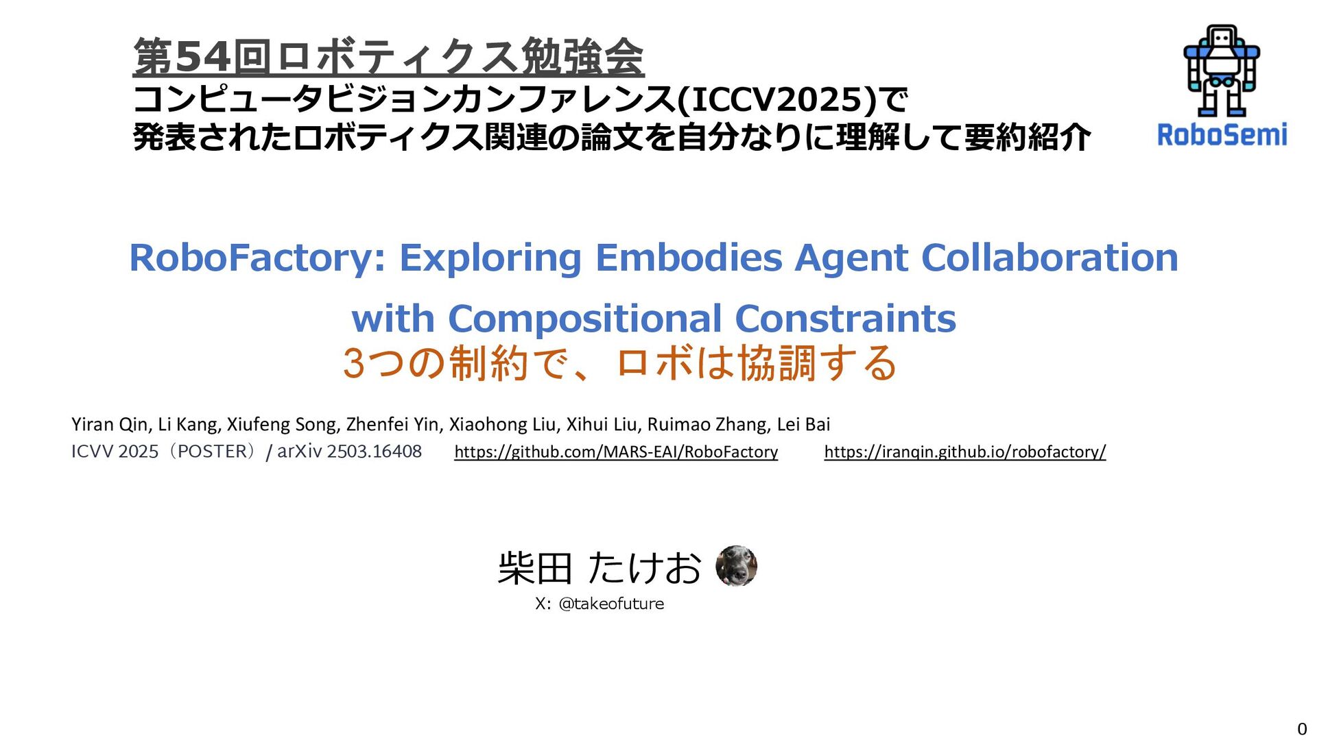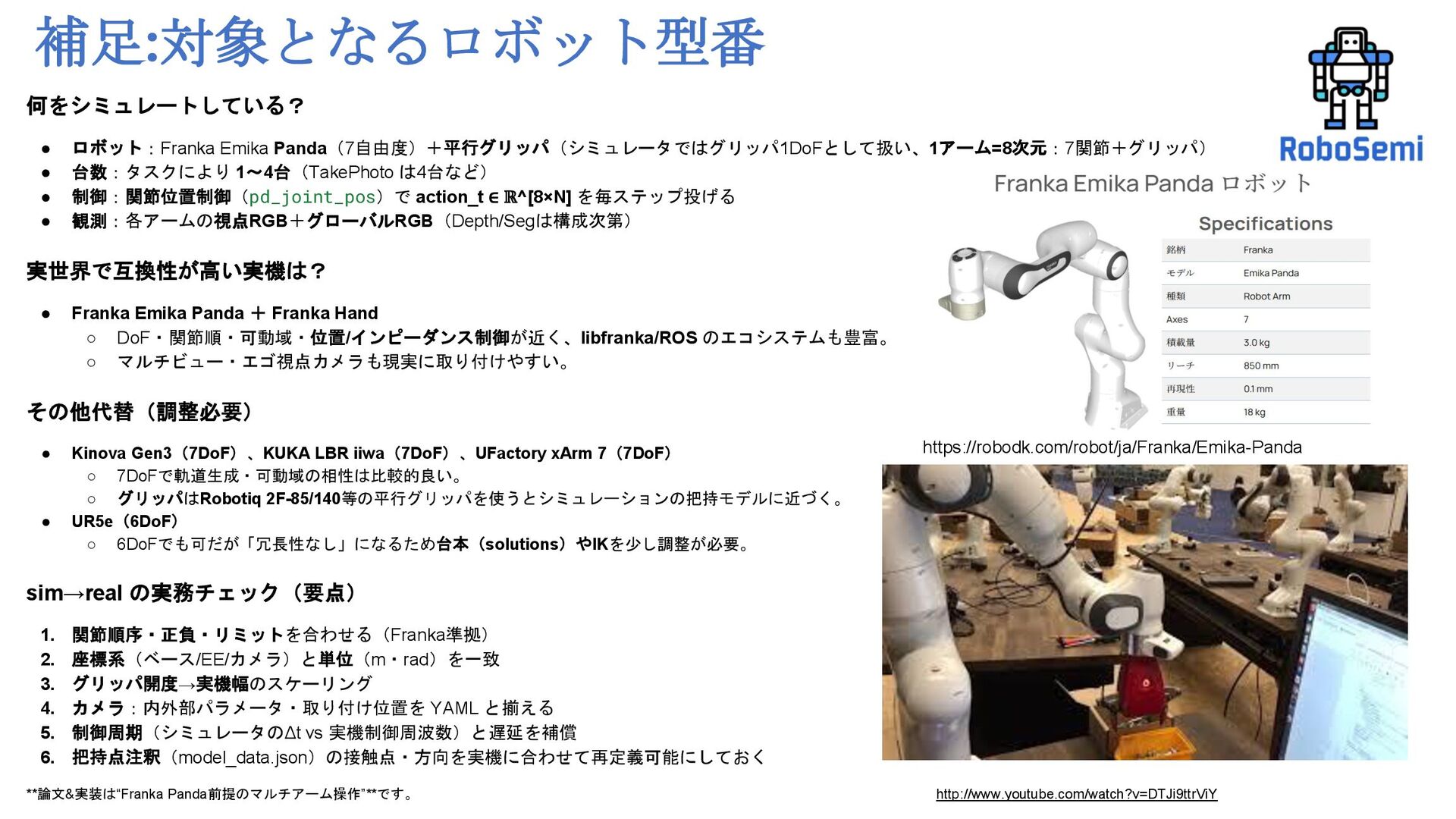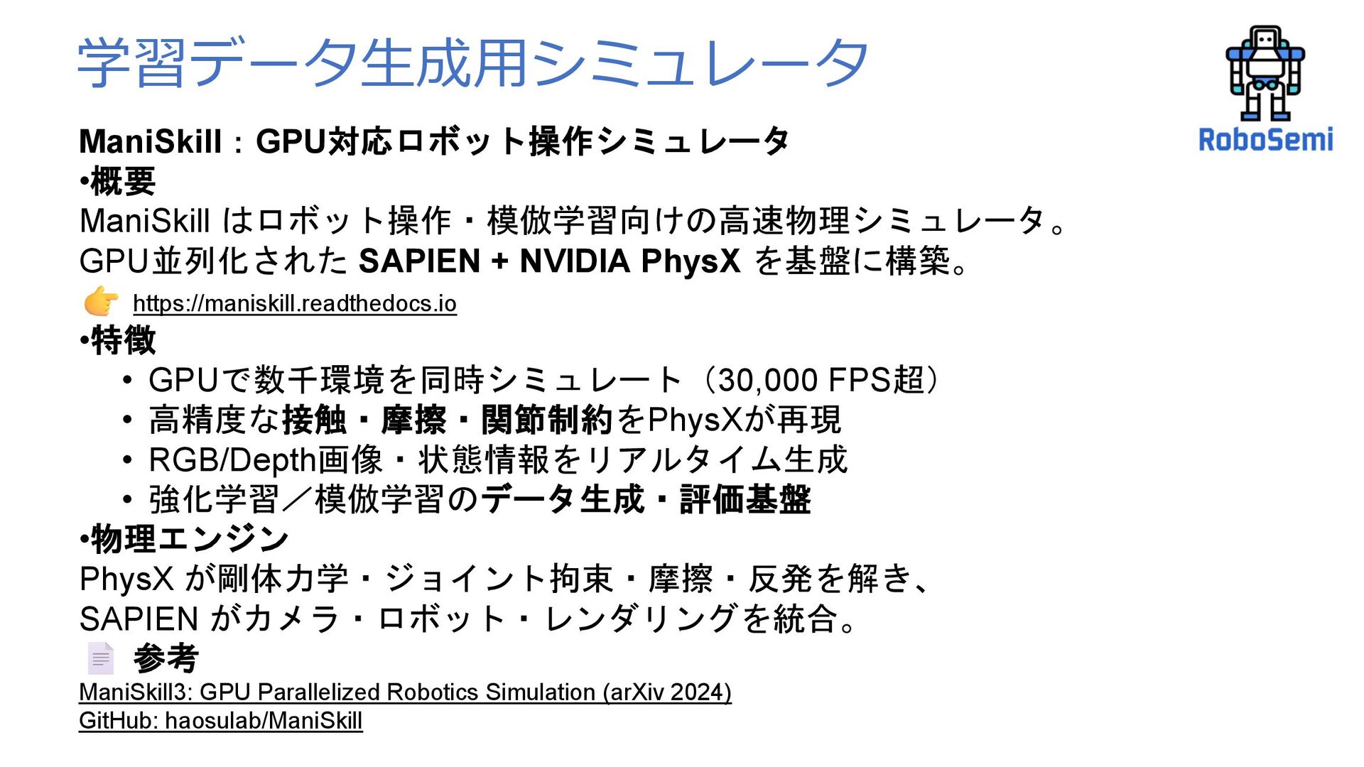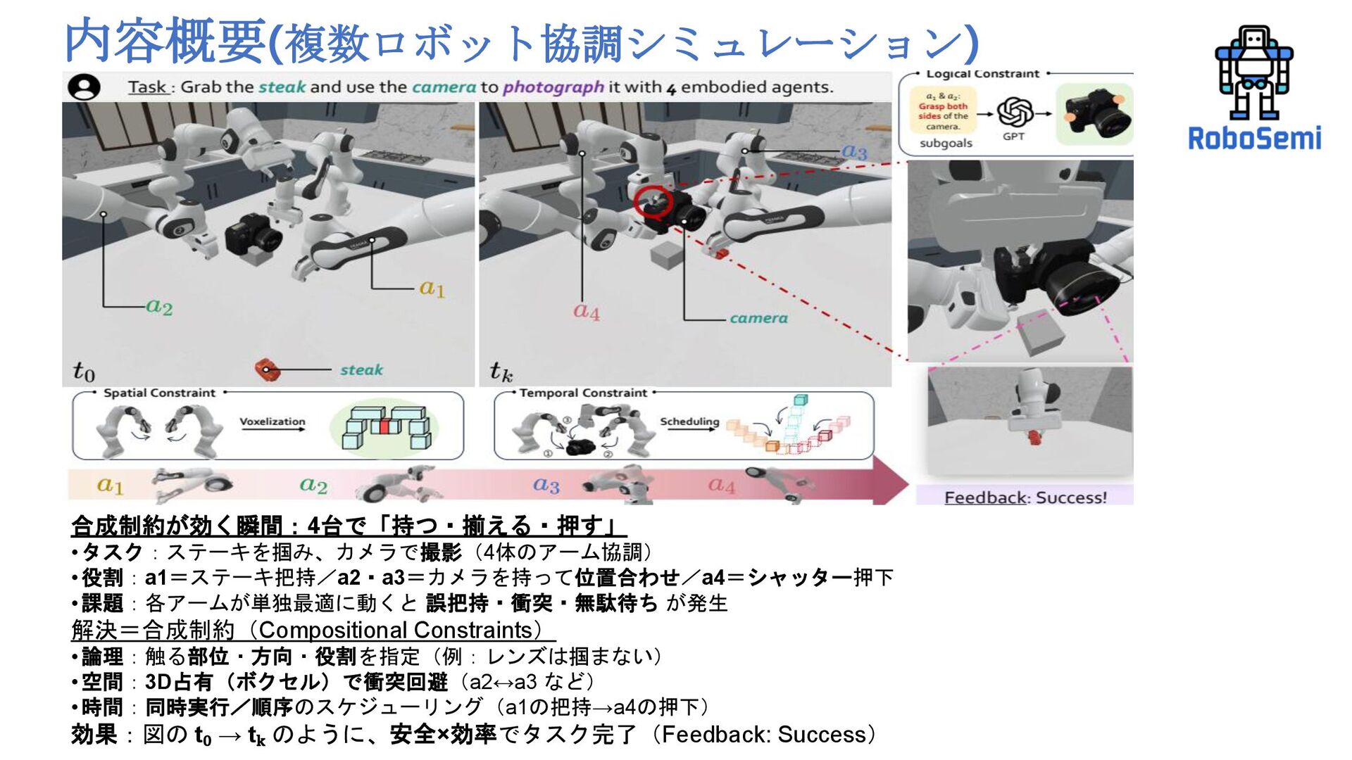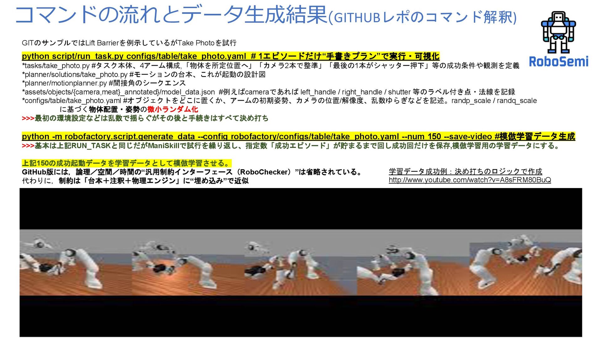 (RoboBrain) ── subgoals + constraints (text/JSON風) │ 例: {"Logical":...,"Spatial":...,"Temporal":...} │ (Pythonパーサで数値引数に変換) ▼ Motion Primitives (Python関数) MOVE/GRASP/LIFT/ALIGN/PRESS(...params) │ └─ 目標姿勢(SE3)・接触点・進入方向・速度など ▼ Trajectory Generator (Python) 目標の離散軌道: waypoints → action 列 形式: trajectory ∈ ℝ^[T × (8 × N_agents)] # Franka=7関節+gripper=1 │ ▼ Simulator (ManiSkill / SAPIEN) step(action_t) at t=1..T ── obs_t 入力 action_t: ℝ^[8×N] (float32) 出力 obs_t: - RGB画像: uint8 [H×W×3](例 320×240) - 状態: q∈ℝ^7, qd∈ℝ^7, gripper∈ℝ^1(float32) - (任意)接触/衝突フラグ等 │ ▼ RoboChecker (Python + GPT-4oでCheckCode生成) テキスト制約 + obs + trajectory → 物理インターフェースで検証 VI=Validate_Interaction(接触点) VD=Validate_Direction(進入方向/姿勢) VSO=Validate_Spatial_Occupancy(3D占有/衝突) VS=Validate_Scheduling(同時/順序) 出力: {valid: bool, reason: str} ├─ valid=false → reason を Feedback として RoboBrain に戻して再計画 └─ valid=true → 次ステップ/次サブゴールへ 概念フロー •RoboBrain(GPT-4o) • 入力:タスク指示(text)、観測(画像/要約)、前回の違反理由(text) • 出力:subgoals(text/JSON風)、constraints={Logical/Spatial/Temporal}(text) • テキスト→(Pythonパーサ)→ モーションプリミティブ( MOVE/GRASP/LIFT/ALIGN/PRESS(...))呼び出し → 暫定軌道を合成 •Trajectory / Action • 形式:trajectory ∈ float32 [T, 8×N_agents](Franka:7関節+gripper=8 ) • 実行時(Gym)はマルチアームなら {uid: action8} の辞書を渡す実装もあり (保存は連結形が多い) •Simulator(ManiSkill / SAPIEN) • 入力:action_t ∈ float32 [8×N] • 出力(Observation):画像 uint8[H,W,3](+必要なら Depth/Seg)、 状態(q, qd, gripper など float32) •RoboChecker(Python + GPT-4oでCheckCode生成) • テキスト制約+obs+trajectory → 物理インターフェースで検証 • VI(接触点)/VD(進入方向)/VSO(3D占有)/VS(同時・順序) • 出力:{valid: bool, reason: str} (false なら理由を RoboBrain に返し再計画) 要点:計画・制約生成=GPT-4o(テキスト)/実行=数値アクション。 RoboCheckerがテキスト制約を数値の判定に写像し、検証→再計画で安全・効率に収束。