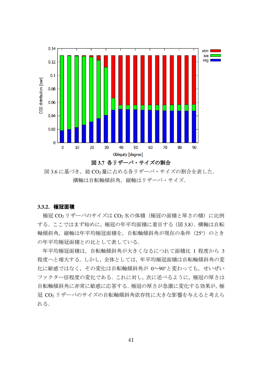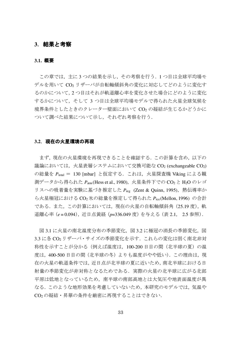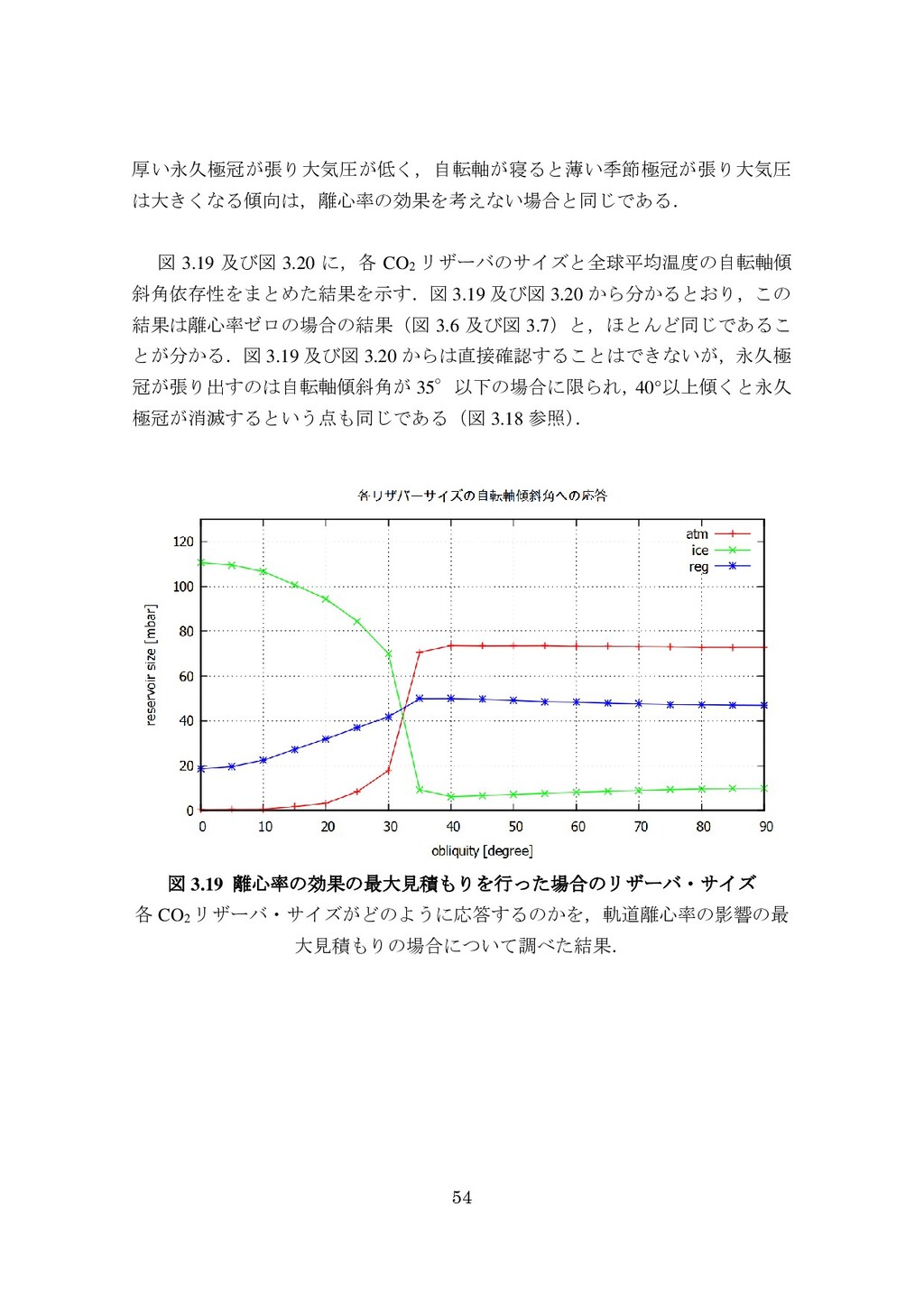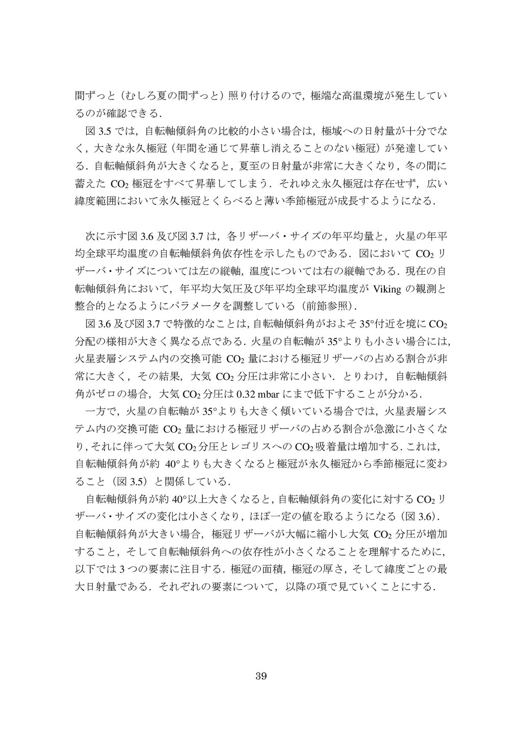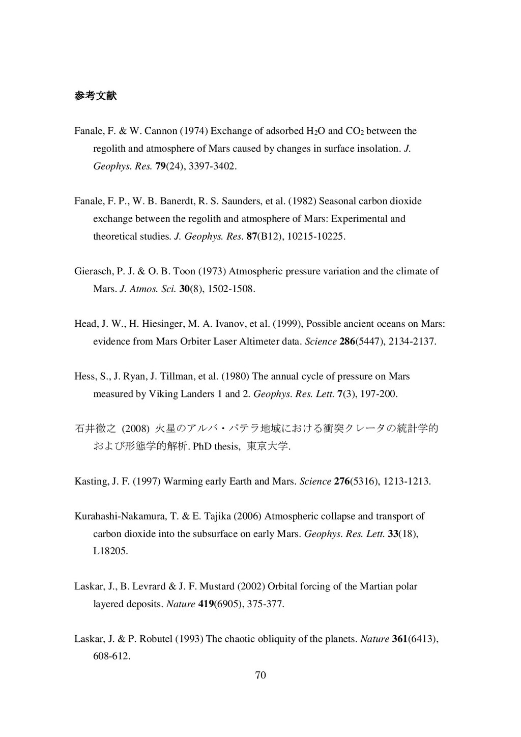 adsorbed H2O and CO2 between the regolith and atmosphere of Mars caused by changes in surface insolation. J. Geophys. Res. 79(24), 3397-3402. Fanale, F. P., W. B. Banerdt, R. S. Saunders, et al. (1982) Seasonal carbon dioxide exchange between the regolith and atmosphere of Mars: Experimental and theoretical studies. J. Geophys. Res. 87(B12), 10215-10225. Gierasch, P. J. & O. B. Toon (1973) Atmospheric pressure variation and the climate of Mars. J. Atmos. Sci. 30(8), 1502-1508. Head, J. W., H. Hiesinger, M. A. Ivanov, et al. (1999), Possible ancient oceans on Mars: evidence from Mars Orbiter Laser Altimeter data. Science 286(5447), 2134-2137. Hess, S., J. Ryan, J. Tillman, et al. (1980) The annual cycle of pressure on Mars measured by Viking Landers 1 and 2. Geophys. Res. Lett. 7(3), 197-200. 石井徹之 (2008) 火星のアルバ・パテラ地域における衝突クレータの統計学的 および形態学的解析. PhD thesis, 東京大学. Kasting, J. F. (1997) Warming early Earth and Mars. Science 276(5316), 1213-1213. Kurahashi-Nakamura, T. & E. Tajika (2006) Atmospheric collapse and transport of carbon dioxide into the subsurface on early Mars. Geophys. Res. Lett. 33(18), L18205. Laskar, J., B. Levrard & J. F. Mustard (2002) Orbital forcing of the Martian polar layered deposits. Nature 419(6905), 375-377. Laskar, J. & P. Robutel (1993) The chaotic obliquity of the planets. Nature 361(6413), 608-612.