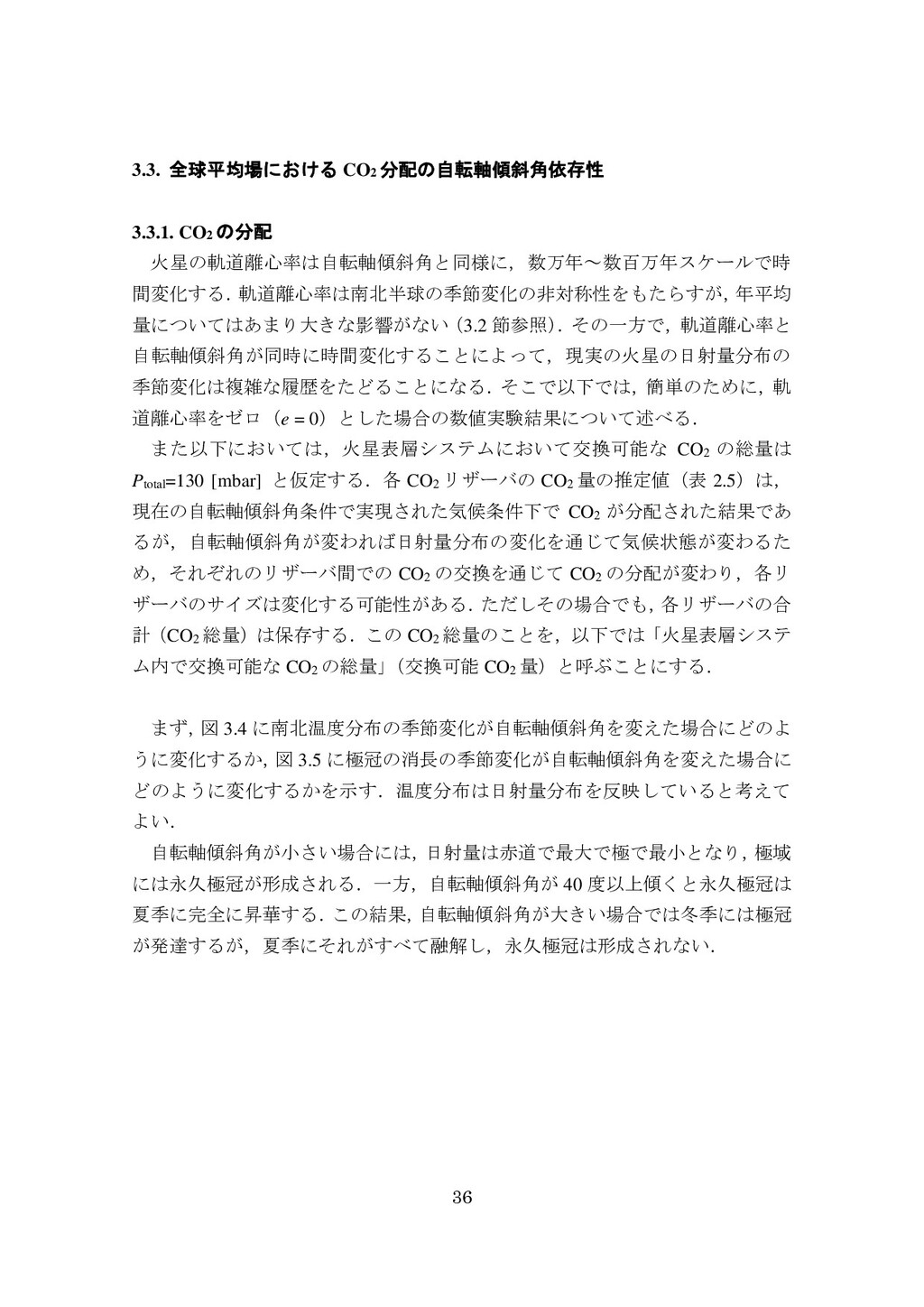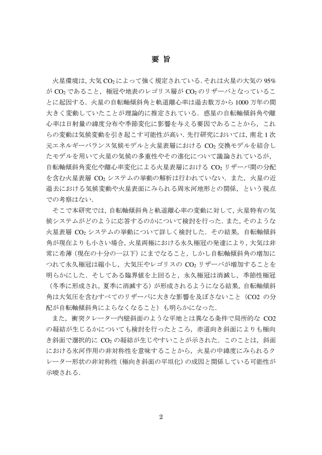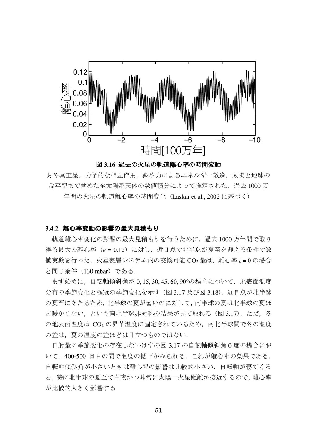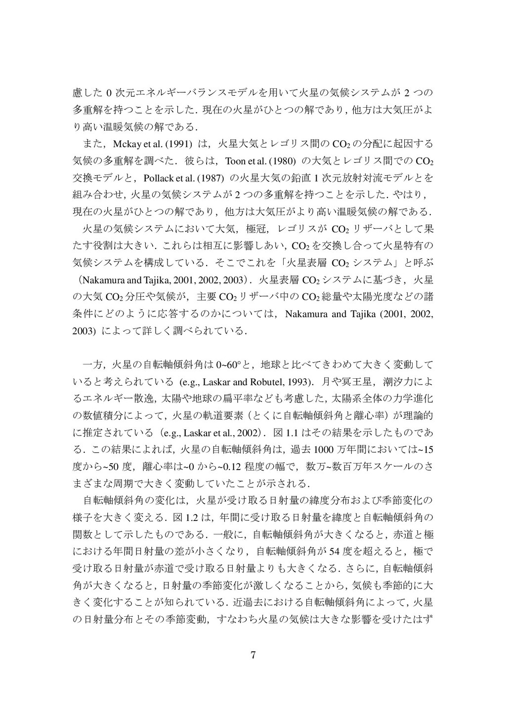 adsorbed H2O and CO2 between the regolith and atmosphere of Mars caused by changes in surface insolation. J. Geophys. Res. 79(24), 3397-3402. Fanale, F. P., W. B. Banerdt, R. S. Saunders, et al. (1982) Seasonal carbon dioxide exchange between the regolith and atmosphere of Mars: Experimental and theoretical studies. J. Geophys. Res. 87(B12), 10215-10225. Gierasch, P. J. & O. B. Toon (1973) Atmospheric pressure variation and the climate of Mars. J. Atmos. Sci. 30(8), 1502-1508. Head, J. W., H. Hiesinger, M. A. Ivanov, et al. (1999), Possible ancient oceans on Mars: evidence from Mars Orbiter Laser Altimeter data. Science 286(5447), 2134-2137. Hess, S., J. Ryan, J. Tillman, et al. (1980) The annual cycle of pressure on Mars measured by Viking Landers 1 and 2. Geophys. Res. Lett. 7(3), 197-200. 石井徹之 (2008) 火星のアルバ・パテラ地域における衝突クレータの統計学的 および形態学的解析. PhD thesis, 東京大学. Kasting, J. F. (1997) Warming early Earth and Mars. Science 276(5316), 1213-1213. Kurahashi-Nakamura, T. & E. Tajika (2006) Atmospheric collapse and transport of carbon dioxide into the subsurface on early Mars. Geophys. Res. Lett. 33(18), L18205. Laskar, J., B. Levrard & J. F. Mustard (2002) Orbital forcing of the Martian polar layered deposits. Nature 419(6905), 375-377. Laskar, J. & P. Robutel (1993) The chaotic obliquity of the planets. Nature 361(6413), 608-612.