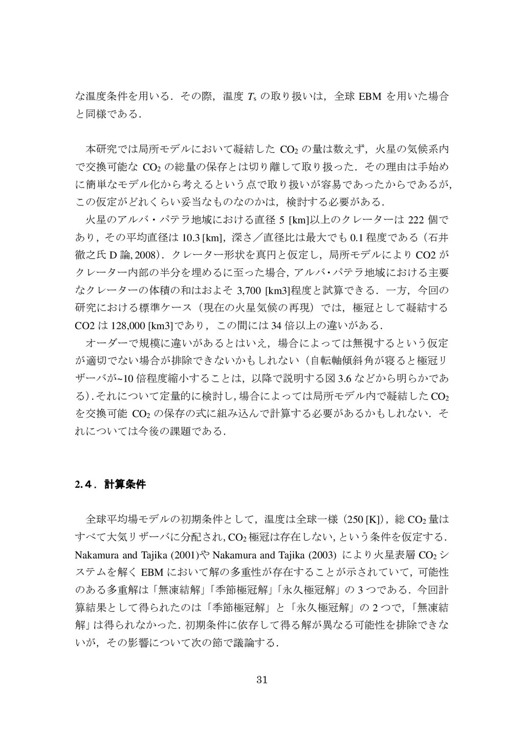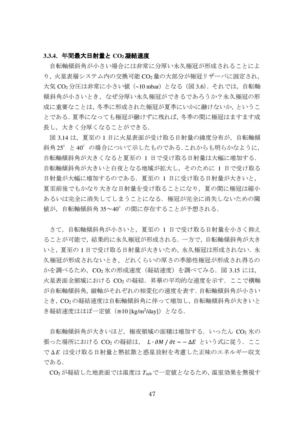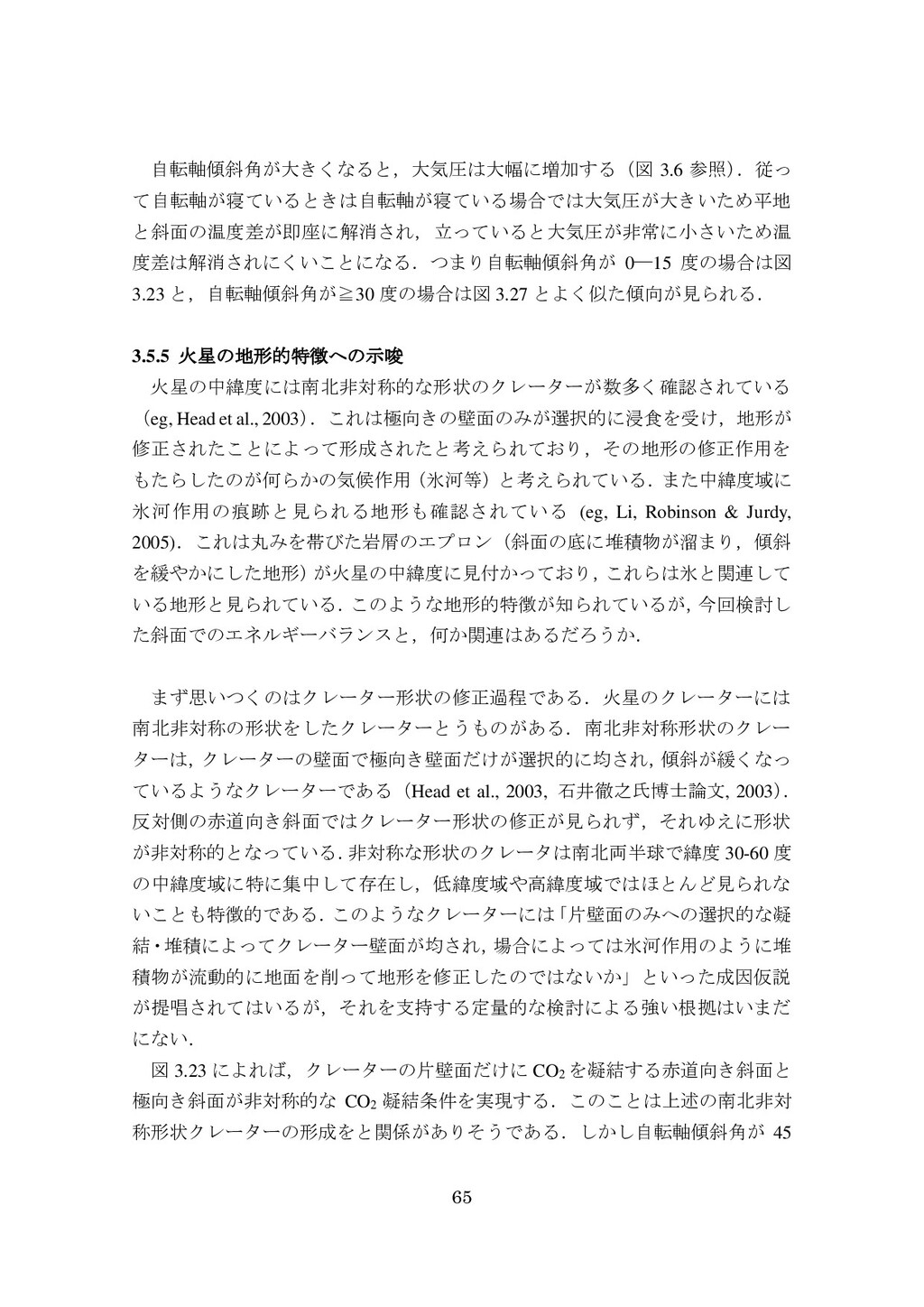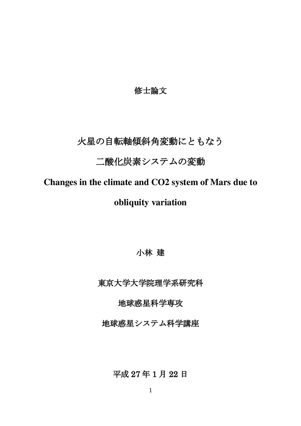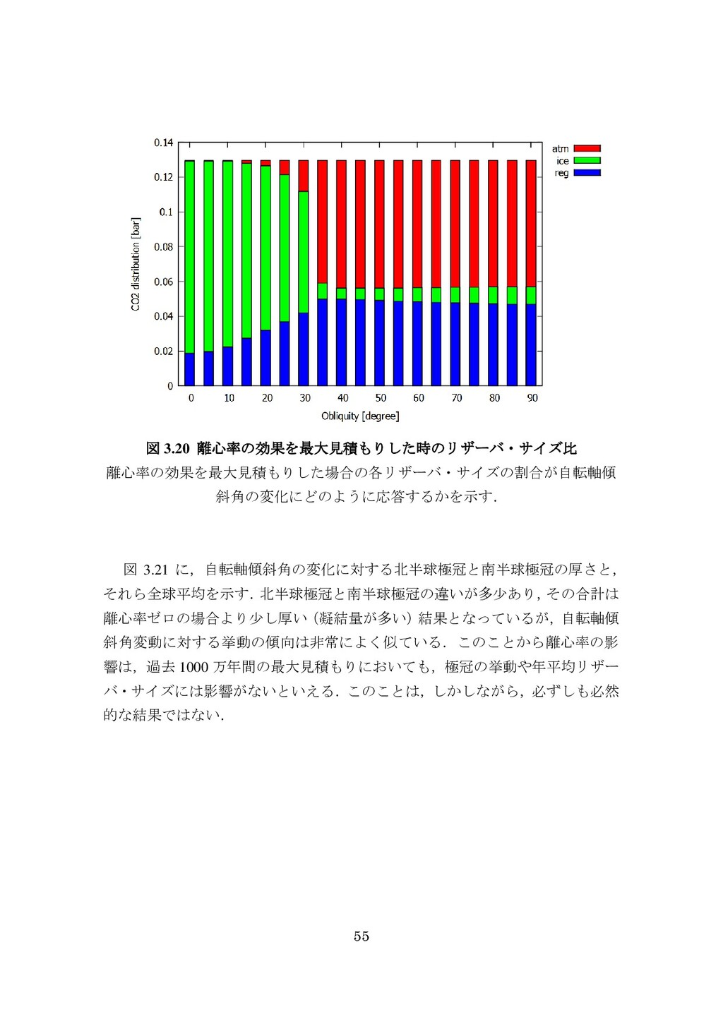 adsorbed H2O and CO2 between the regolith and atmosphere of Mars caused by changes in surface insolation. J. Geophys. Res. 79(24), 3397-3402. Fanale, F. P., W. B. Banerdt, R. S. Saunders, et al. (1982) Seasonal carbon dioxide exchange between the regolith and atmosphere of Mars: Experimental and theoretical studies. J. Geophys. Res. 87(B12), 10215-10225. Gierasch, P. J. & O. B. Toon (1973) Atmospheric pressure variation and the climate of Mars. J. Atmos. Sci. 30(8), 1502-1508. Head, J. W., H. Hiesinger, M. A. Ivanov, et al. (1999), Possible ancient oceans on Mars: evidence from Mars Orbiter Laser Altimeter data. Science 286(5447), 2134-2137. Hess, S., J. Ryan, J. Tillman, et al. (1980) The annual cycle of pressure on Mars measured by Viking Landers 1 and 2. Geophys. Res. Lett. 7(3), 197-200. 石井徹之 (2008) 火星のアルバ・パテラ地域における衝突クレータの統計学的 および形態学的解析. PhD thesis, 東京大学. Kasting, J. F. (1997) Warming early Earth and Mars. Science 276(5316), 1213-1213. Kurahashi-Nakamura, T. & E. Tajika (2006) Atmospheric collapse and transport of carbon dioxide into the subsurface on early Mars. Geophys. Res. Lett. 33(18), L18205. Laskar, J., B. Levrard & J. F. Mustard (2002) Orbital forcing of the Martian polar layered deposits. Nature 419(6905), 375-377. Laskar, J. & P. Robutel (1993) The chaotic obliquity of the planets. Nature 361(6413), 608-612.