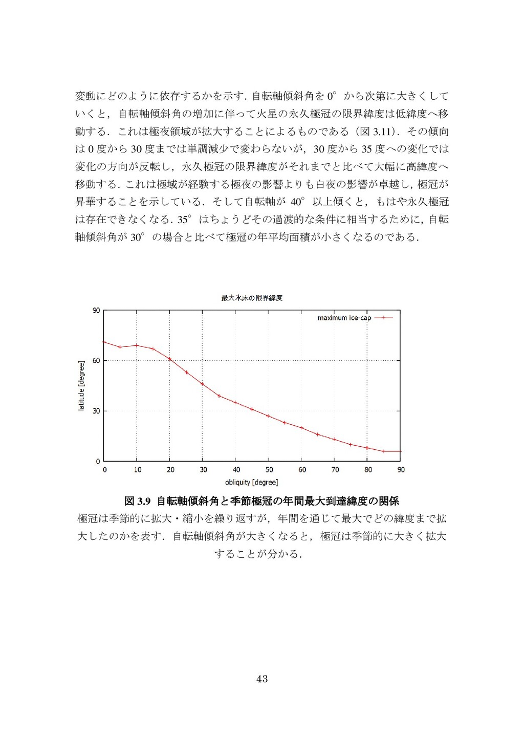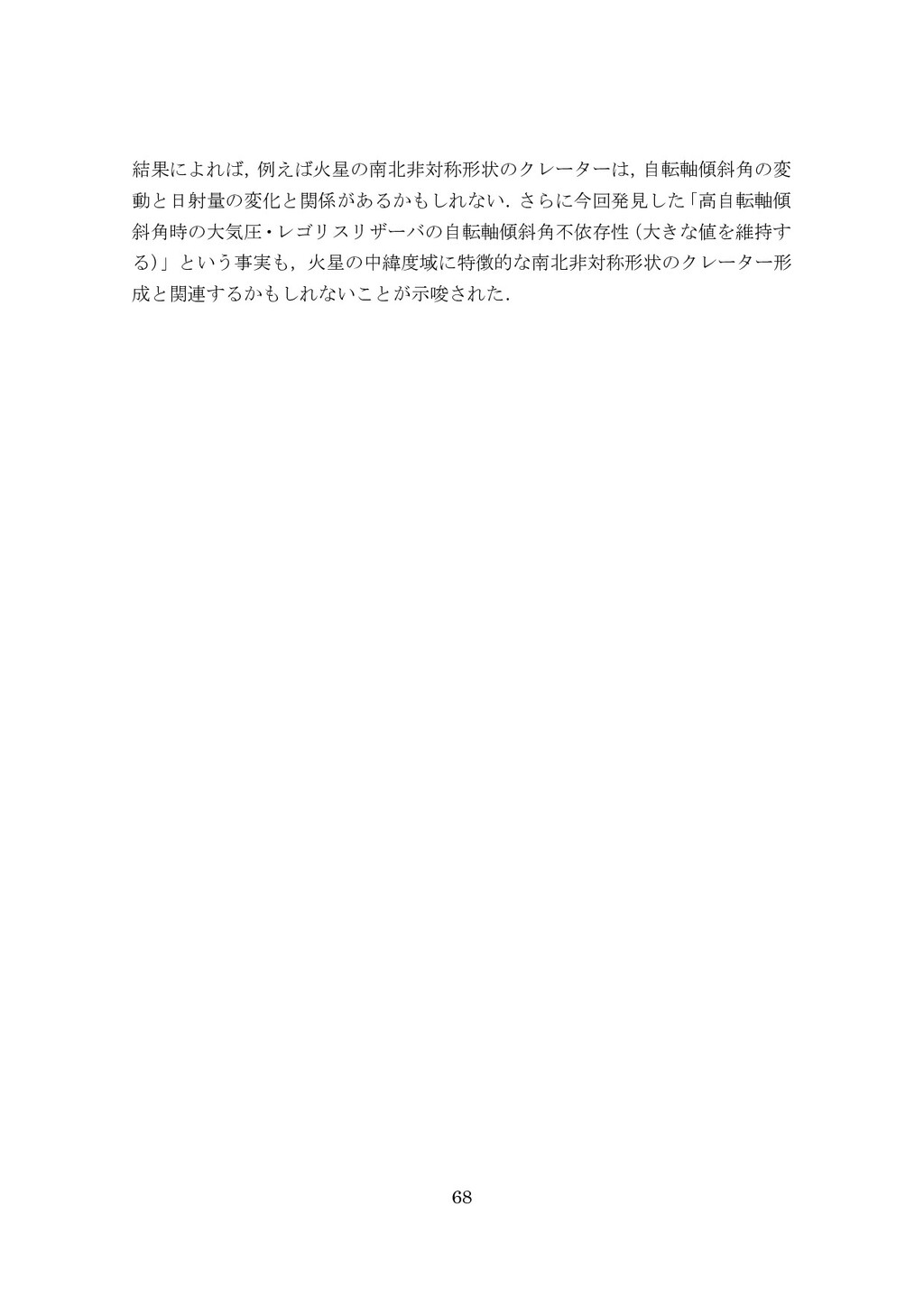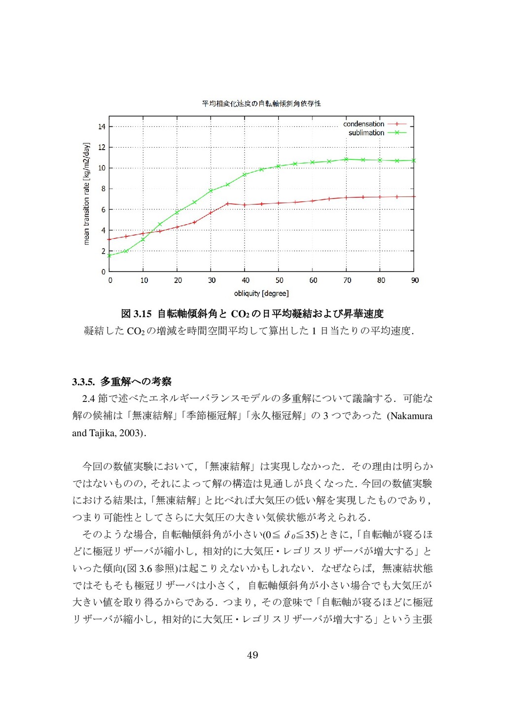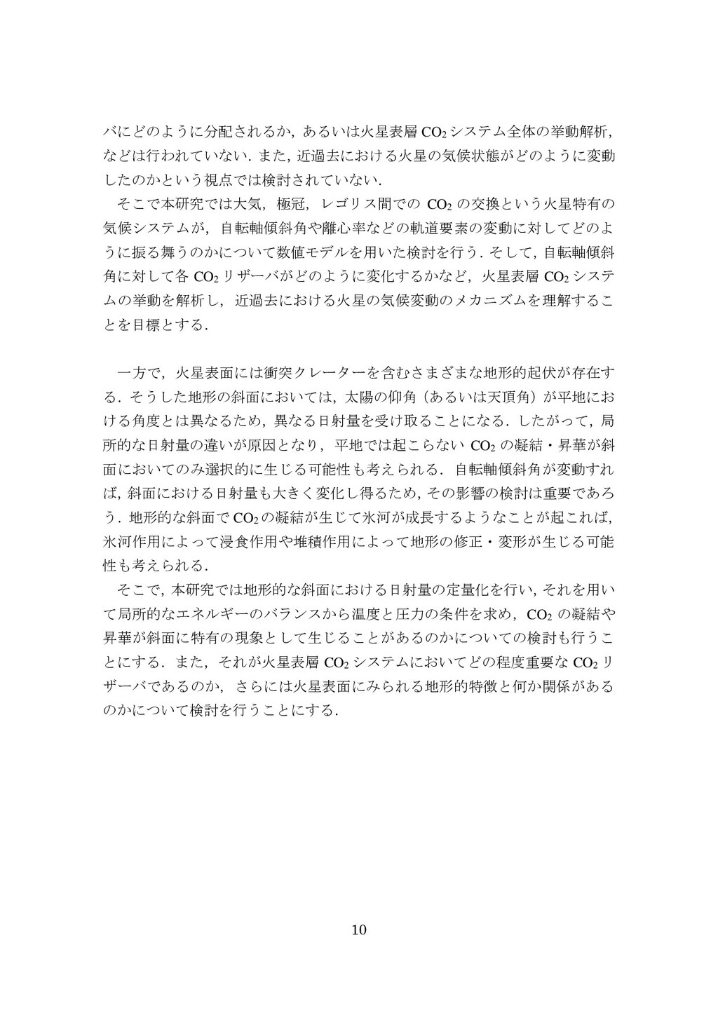 adsorbed H2O and CO2 between the regolith and atmosphere of Mars caused by changes in surface insolation. J. Geophys. Res. 79(24), 3397-3402. Fanale, F. P., W. B. Banerdt, R. S. Saunders, et al. (1982) Seasonal carbon dioxide exchange between the regolith and atmosphere of Mars: Experimental and theoretical studies. J. Geophys. Res. 87(B12), 10215-10225. Gierasch, P. J. & O. B. Toon (1973) Atmospheric pressure variation and the climate of Mars. J. Atmos. Sci. 30(8), 1502-1508. Head, J. W., H. Hiesinger, M. A. Ivanov, et al. (1999), Possible ancient oceans on Mars: evidence from Mars Orbiter Laser Altimeter data. Science 286(5447), 2134-2137. Hess, S., J. Ryan, J. Tillman, et al. (1980) The annual cycle of pressure on Mars measured by Viking Landers 1 and 2. Geophys. Res. Lett. 7(3), 197-200. 石井徹之 (2008) 火星のアルバ・パテラ地域における衝突クレータの統計学的 および形態学的解析. PhD thesis, 東京大学. Kasting, J. F. (1997) Warming early Earth and Mars. Science 276(5316), 1213-1213. Kurahashi-Nakamura, T. & E. Tajika (2006) Atmospheric collapse and transport of carbon dioxide into the subsurface on early Mars. Geophys. Res. Lett. 33(18), L18205. Laskar, J., B. Levrard & J. F. Mustard (2002) Orbital forcing of the Martian polar layered deposits. Nature 419(6905), 375-377. Laskar, J. & P. Robutel (1993) The chaotic obliquity of the planets. Nature 361(6413), 608-612.