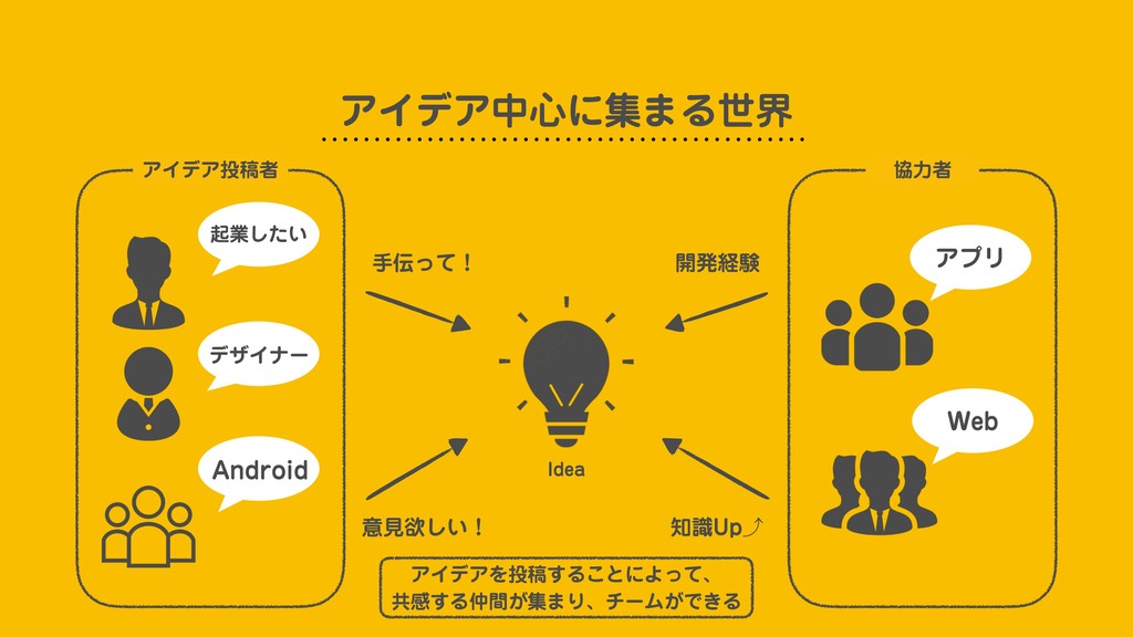 ΞΠσΞߘऀ ڠྗऀ ΞΠσΞத৺ʹू·Δੈք ΞΠσΞΛߘ͢Δ͜ͱʹΑͬͯɺ ڞײ͢Δ͕ؒू·ΓɺνʔϜ͕Ͱ͖Δ