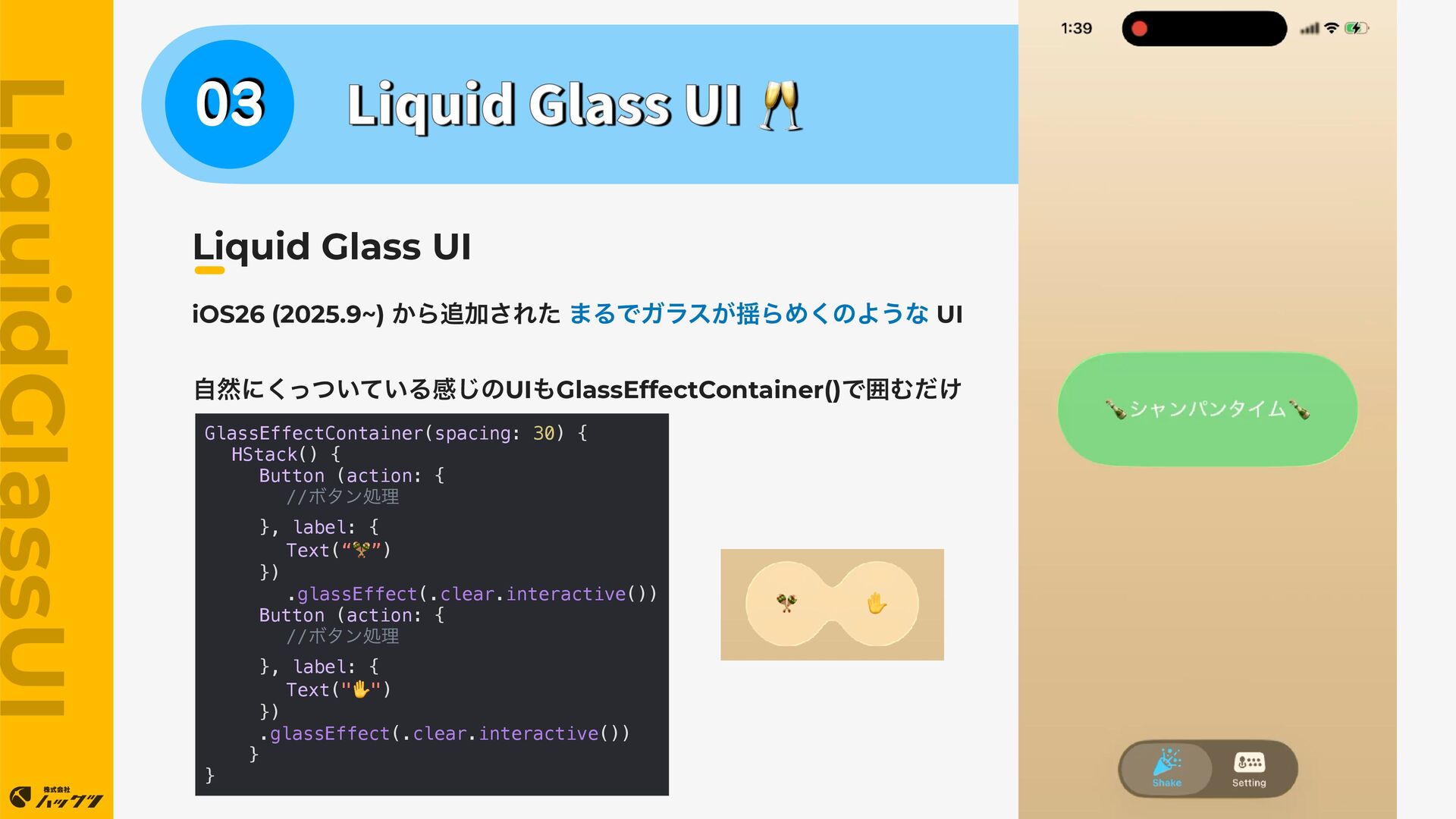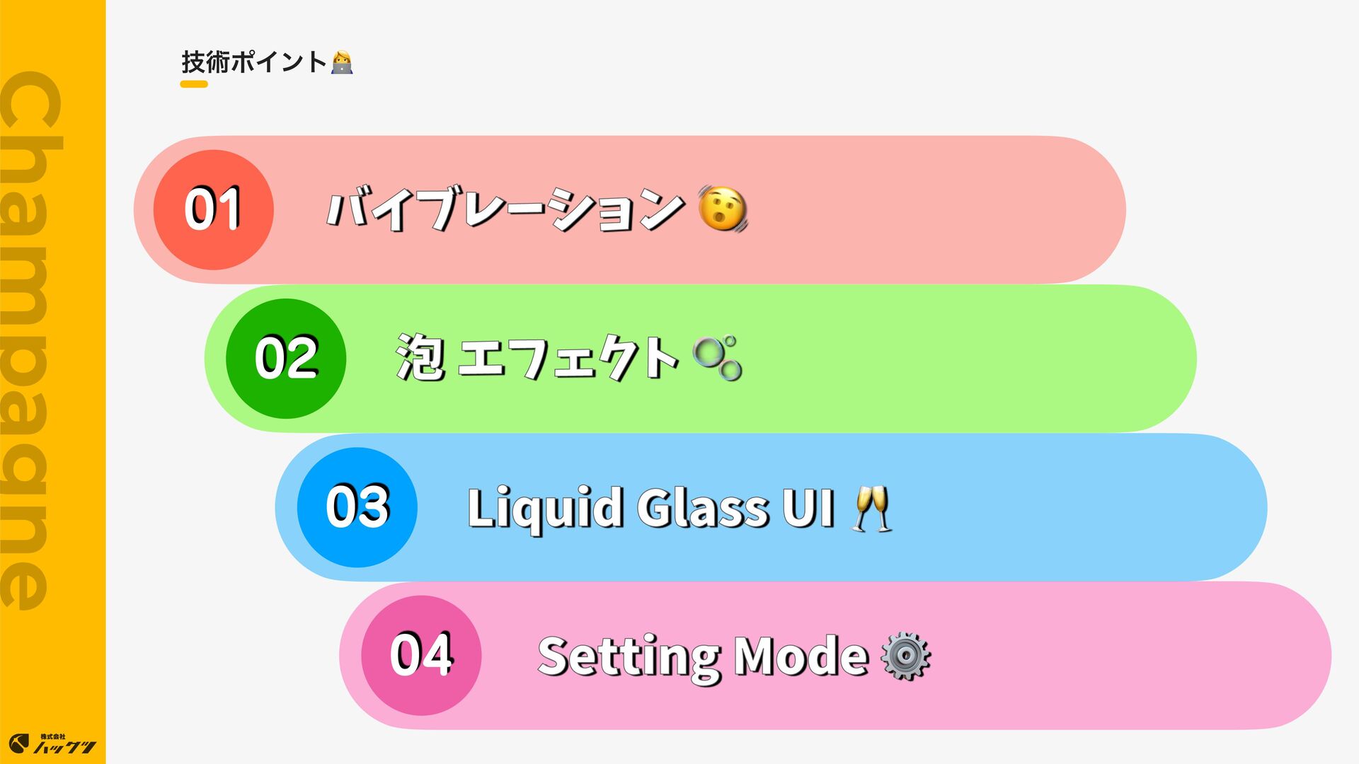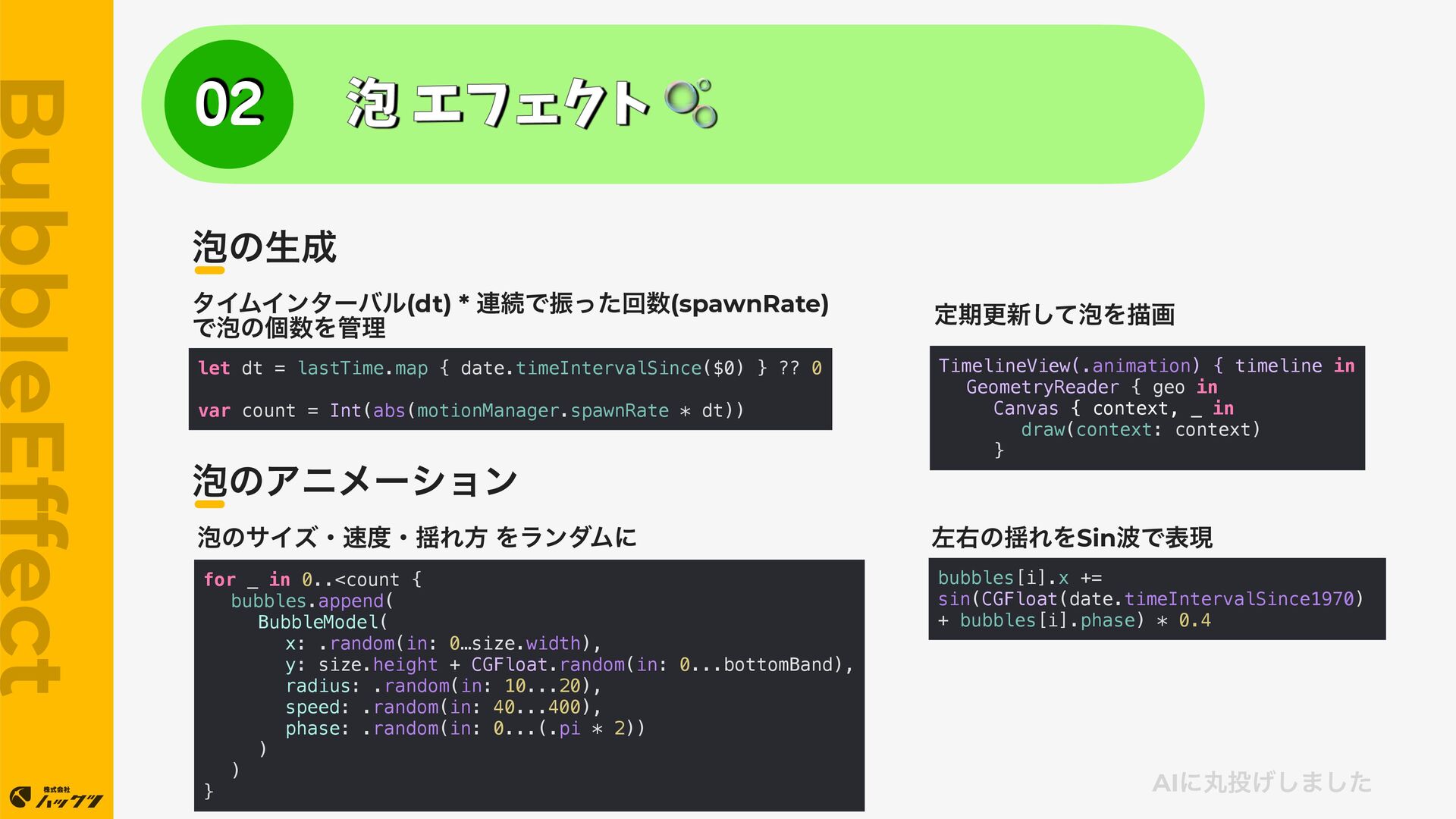 + bubbles[i].phase) * 0.4 let dt = lastTime.map { date.timeIntervalSince($0) } ?? 0 var count = Int(abs(motionManager.spawnRate * dt)) λΠϜΠϯλʔόϧ(dt) * ࿈ଓͰৼͬͨճ(spawnRate) Ͱ๐ͷݸΛཧ ๐ͷΞχϝʔγϣϯ for _ in 0..<count { bubbles.append( BubbleModel( x: .random(in: 0…size.width), y: size.height + CGFloat.random(in: 0...bottomBand), radius: .random(in: 10...20), speed: .random(in: 40...400), phase: .random(in: 0...(.pi * 2)) ) ) } ๐ͷαΠζɾɾ༳Εํ ΛϥϯμϜʹ ఆظߋ৽ͯ͠๐Λඳը TimelineView(.animation) { timeline in GeometryReader { geo in Canvas { context, _ in draw(context: context) } AIʹؙ͛͠·ͨ͠