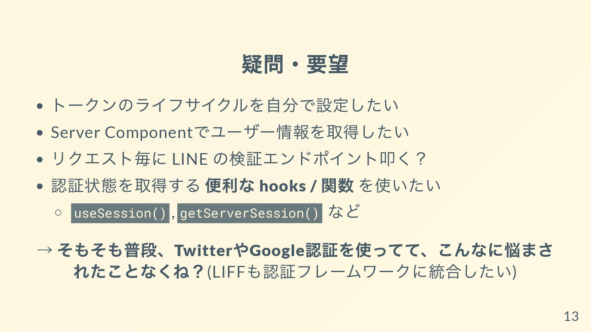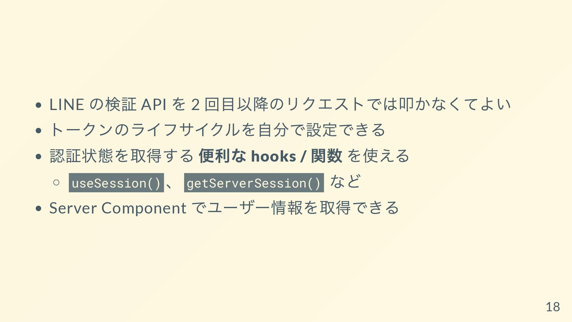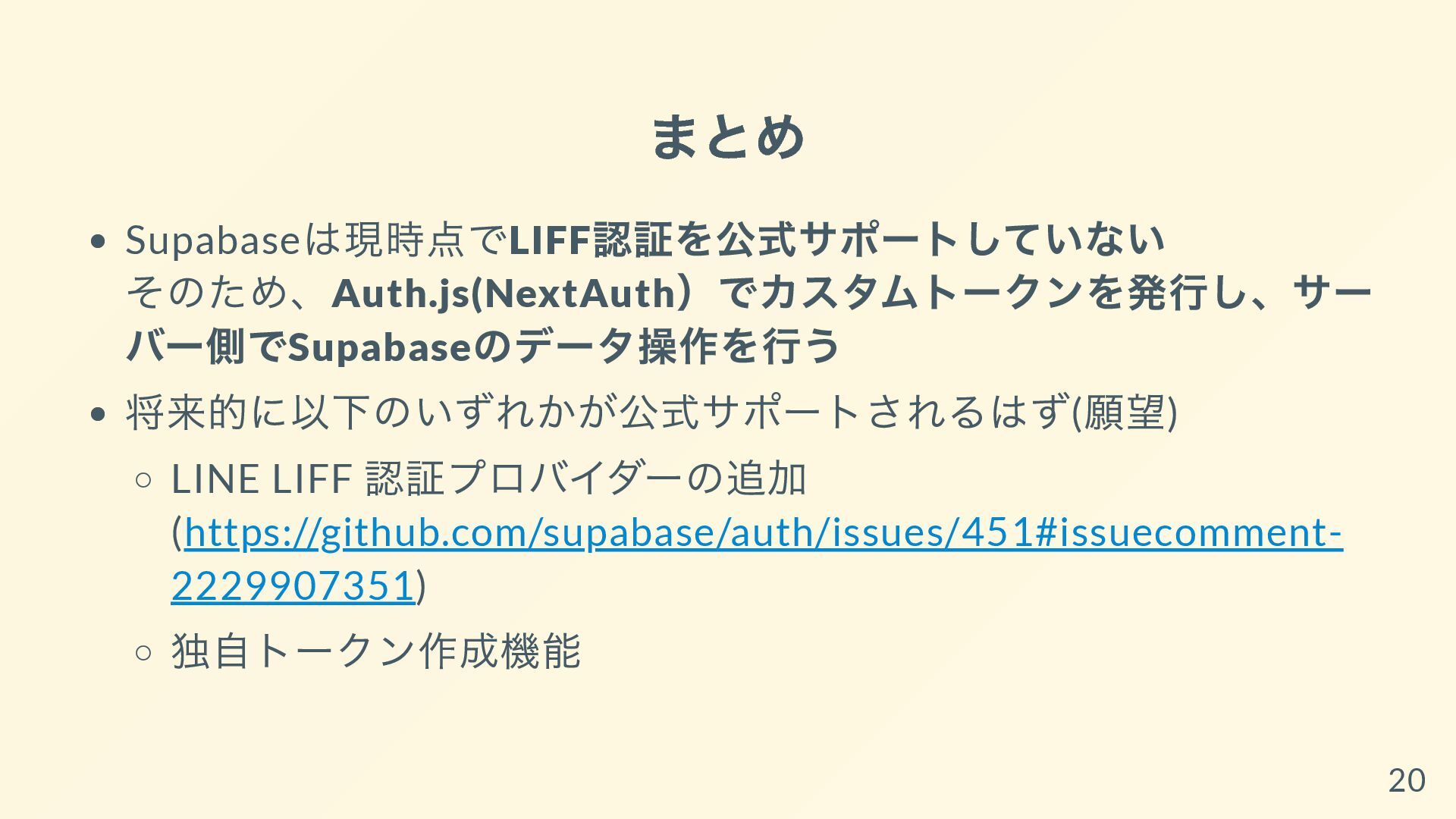 このスライドでは、App RouterのServer ComponentとLINE LIFFの相性問題や、LIFF × Supabaseの認証連携の難しさにフォーカスし、その解決策としてLIFFのIDトークンをAuth.jsに詰め替える実装方法を詳しく紹介しています。
