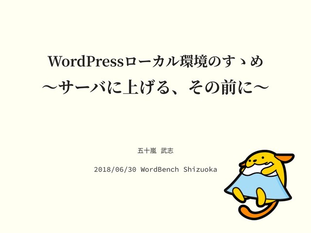 WordPressローカル環境のすゝめ 〜サーバに上げる、その前に〜 五⼗嵐 武志 2018/06/30 WordBench Shizuoka
