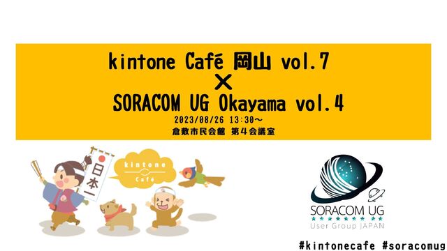 2023/08/26に倉敷で開催されたkintone Café 岡山 vol.7 × SORACOM UG Okayama vol.4のオープニング説明スライドです。
