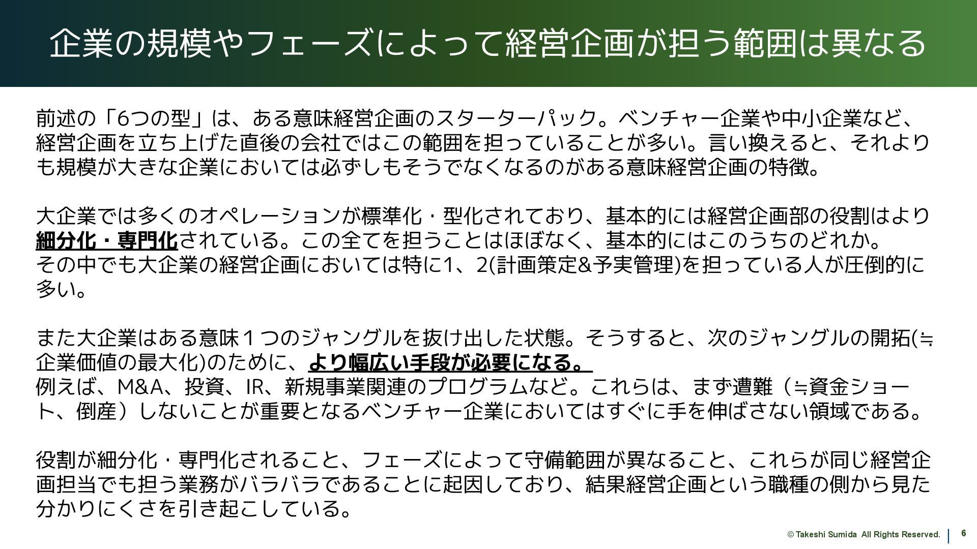 経営企画という職種は、概して役割が広い上に、会社の規模やフェーズによっても担う範囲が異なるため、世の中に数ある職種の中でも、あまり明確に理解されていない職種の一つなのではないかと思います。