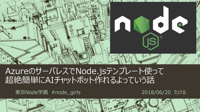 AzureのサーバレスでNode.jsテンプレート使って 超絶簡単にAIチャットボット作れるよっていう話 東京Node学園 #node_girls 2018/06/20 たける