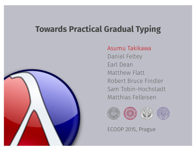 propose looking at lattice of type con�gurations Discover good/bad paths, pathological performance issues Gradual type systems should have a design/eval feedback cycle Model → Implementation → Evaluation → Model → ... Thank you / Děkuji http://docs.racket-lang.org/ts-guide/