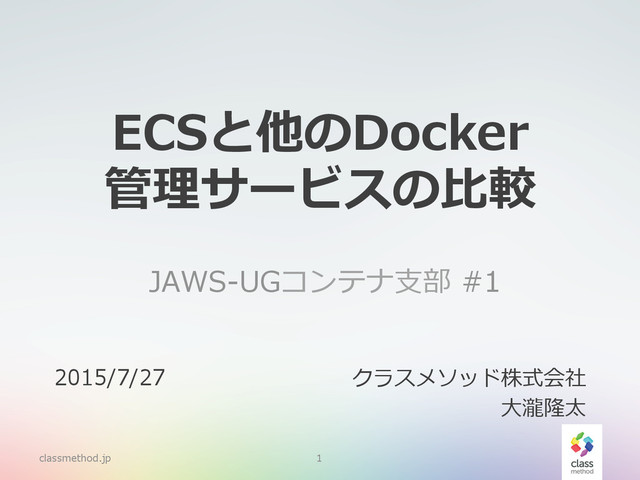 ECSと他のDocker 管理理サービスの⽐比較 JAWS-‐‑‒UGコンテナ⽀支部 #1 classmethod.jp 1 2015/7/27 クラスメソッド株式会社 ⼤大瀧隆太