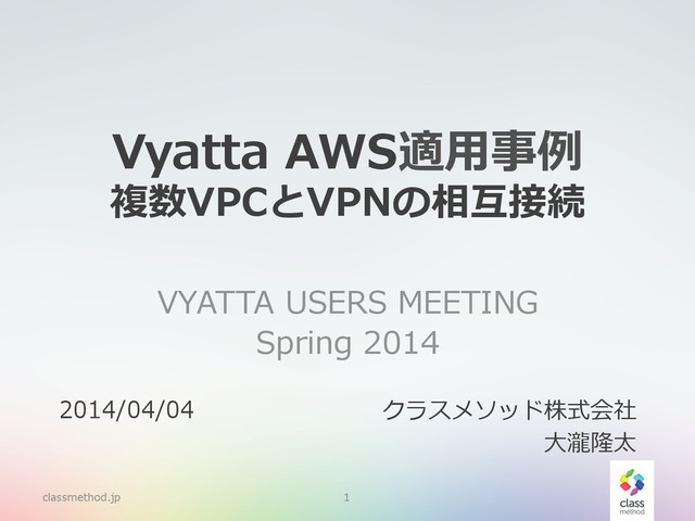 Vyatta AWS適⽤用事例例 複数VPCとVPNの相互接続 VYATTA USERS MEETING Spring 2014 classmethod.jp 1