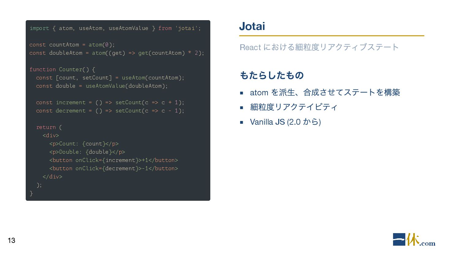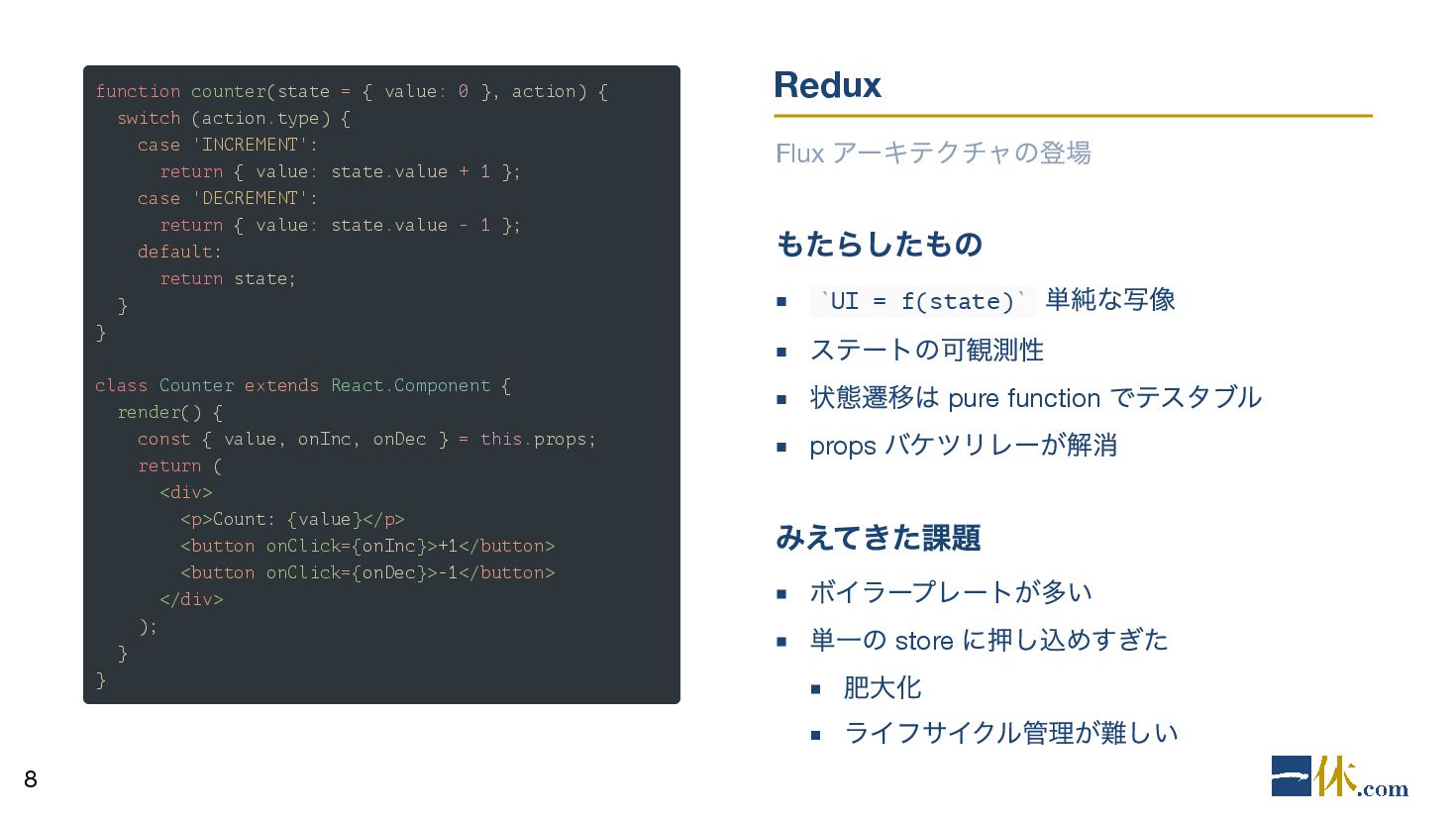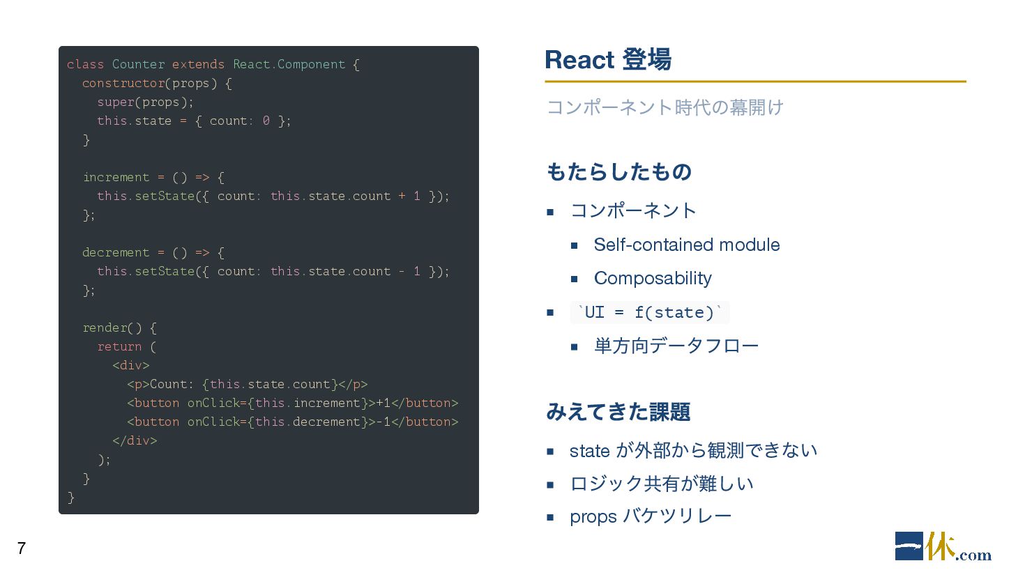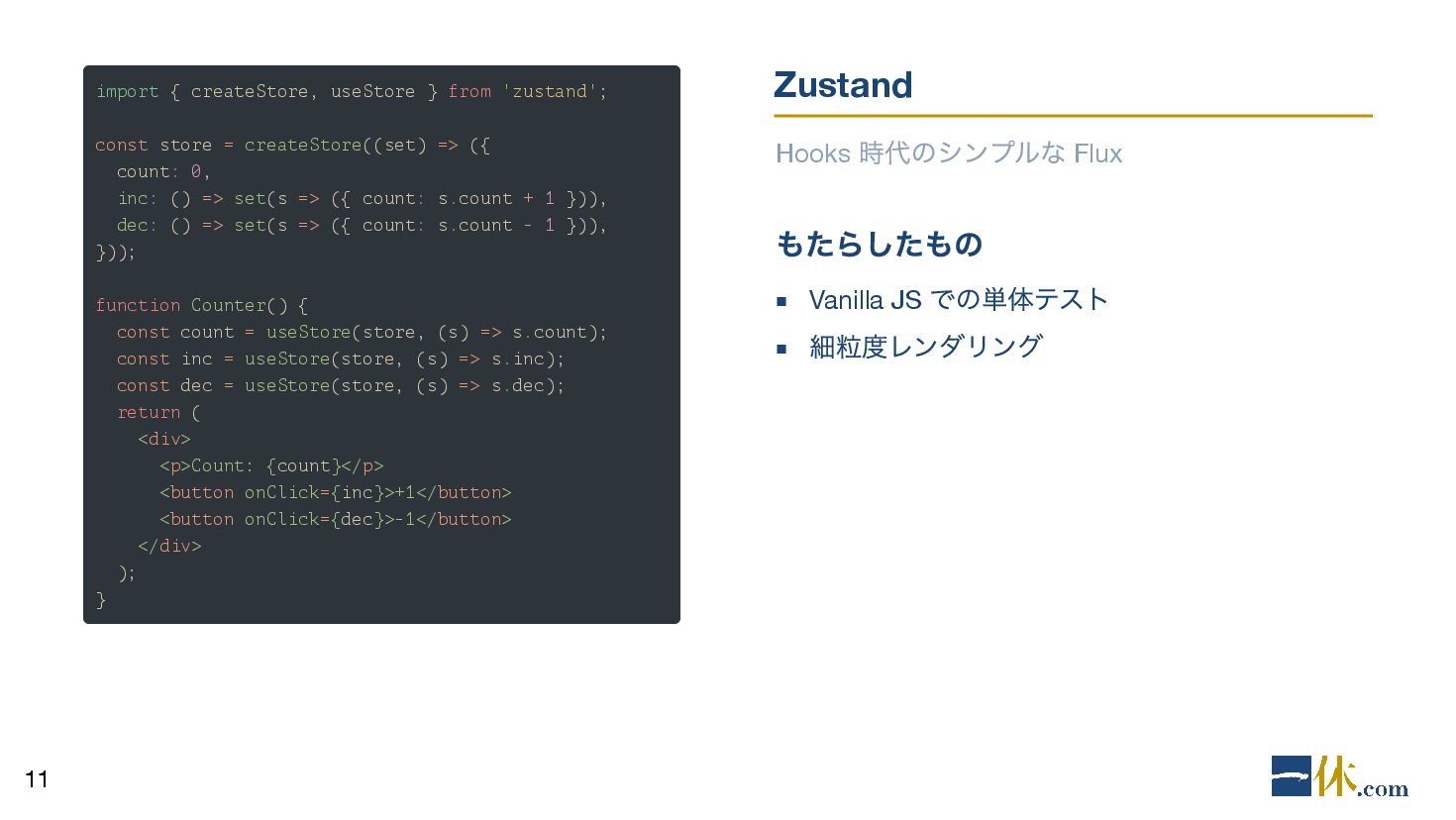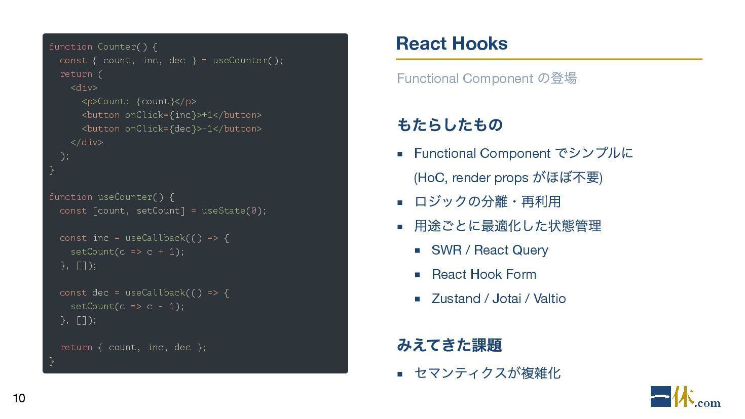 がほぼ不要) ロジックの分離・再利用 用途ごとに最適化した状態管理 SWR / React Query React Hook Form Zustand / Jotai / Valtio みえてきた課題 セマンティクスが複雑化 function Counter() { const { count, inc, dec } = useCounter(); return ( <div> <p>Count: {count}</p> <button onClick={inc}>+1</button> <button onClick={dec}>-1</button> </div> ); } function useCounter() { const [count, setCount] = useState(0); const inc = useCallback(() => { setCount(c => c + 1); }, []); const dec = useCallback(() => { setCount(c => c - 1); }, []); return { count, inc, dec }; } Functional Component の登場