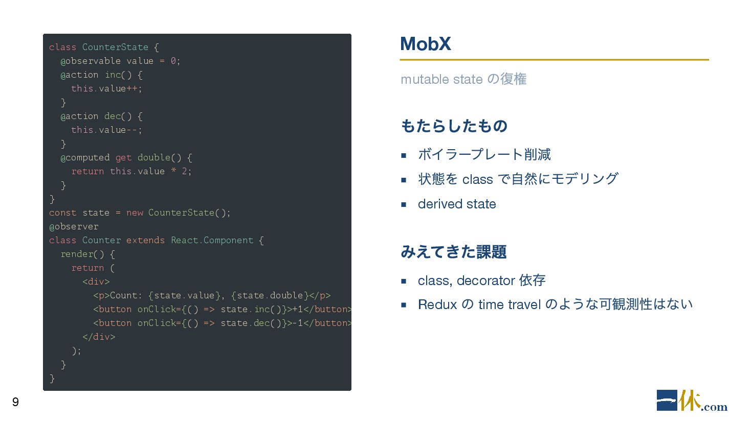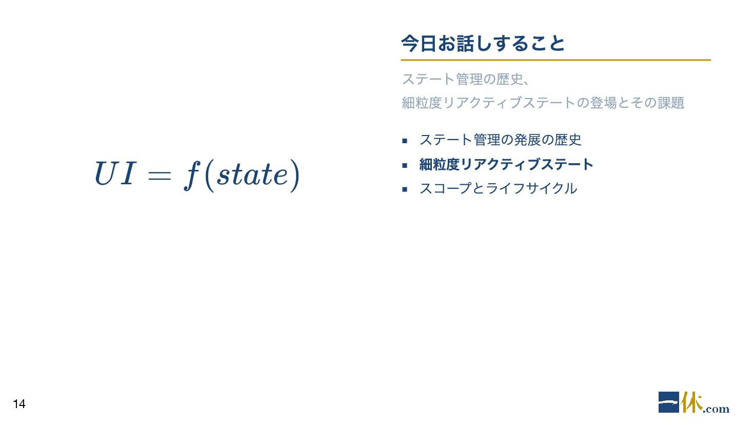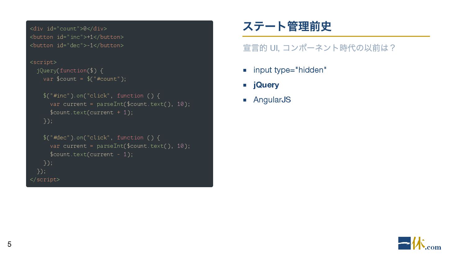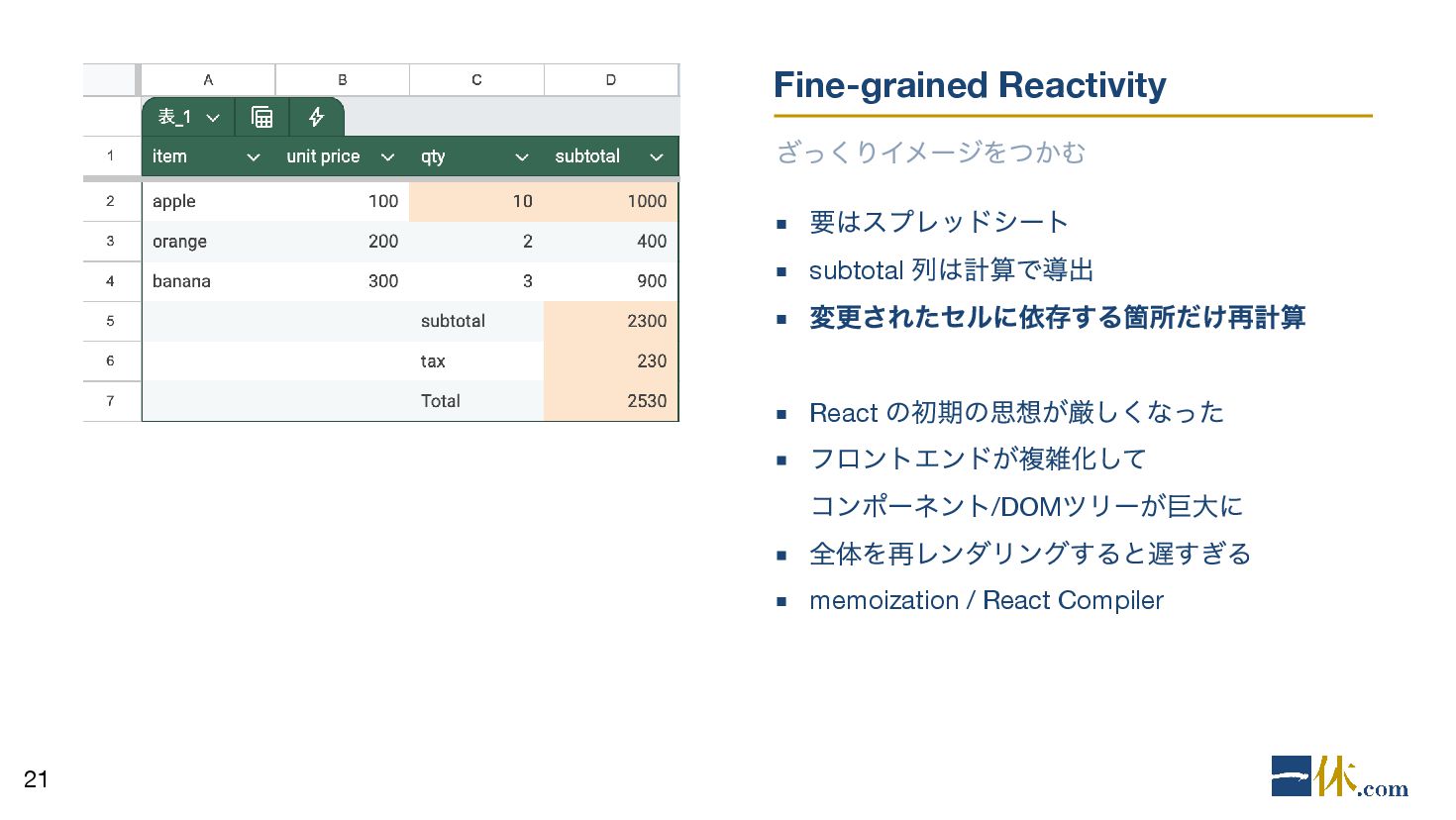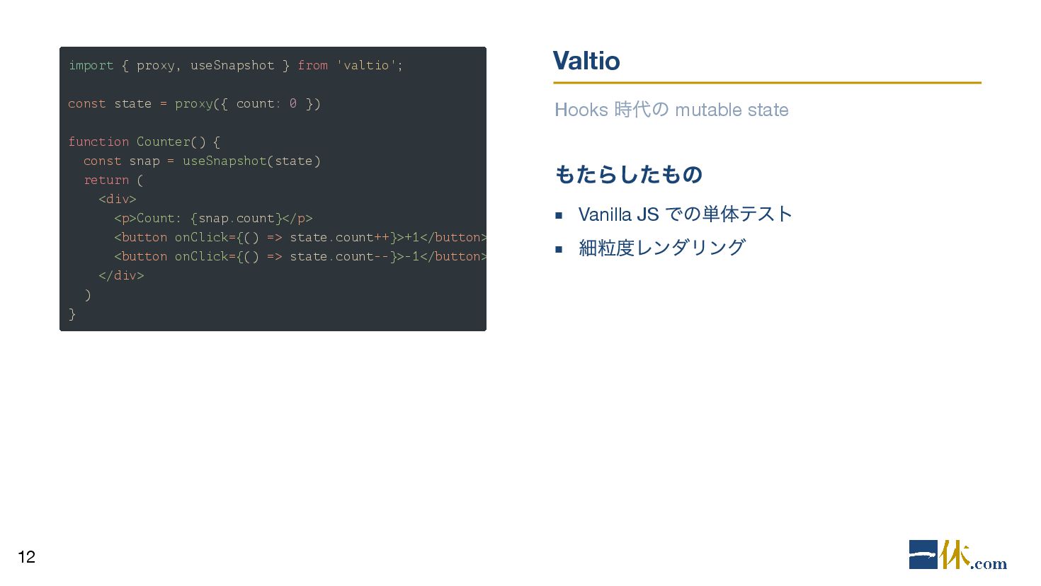 がほぼ不要) ロジックの分離・再利用 用途ごとに最適化した状態管理 SWR / React Query React Hook Form Zustand / Jotai / Valtio みえてきた課題 セマンティクスが複雑化 function Counter() { const { count, inc, dec } = useCounter(); return ( <div> <p>Count: {count}</p> <button onClick={inc}>+1</button> <button onClick={dec}>-1</button> </div> ); } function useCounter() { const [count, setCount] = useState(0); const inc = useCallback(() => { setCount(c => c + 1); }, []); const dec = useCallback(() => { setCount(c => c - 1); }, []); return { count, inc, dec }; } Functional Component の登場