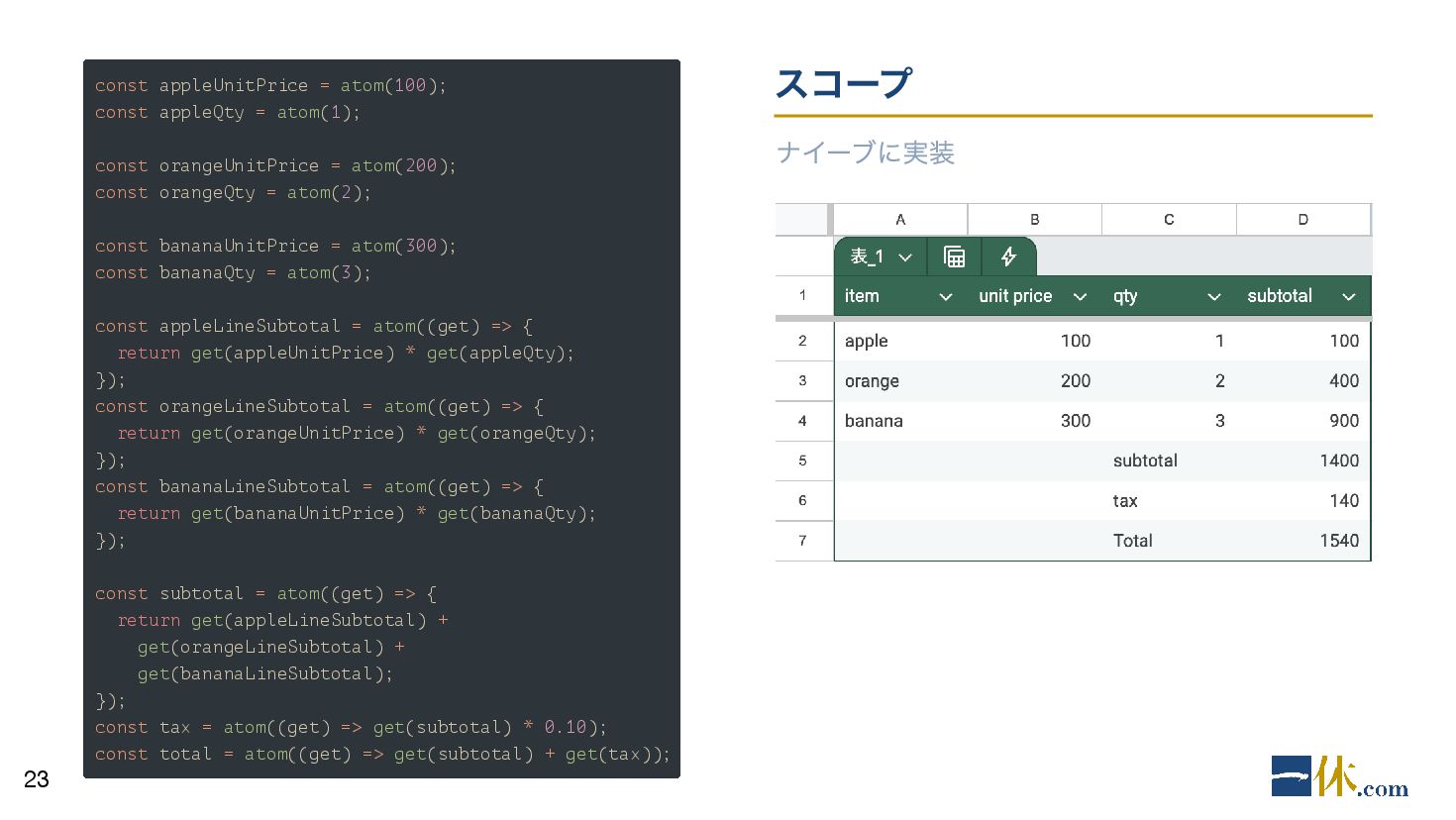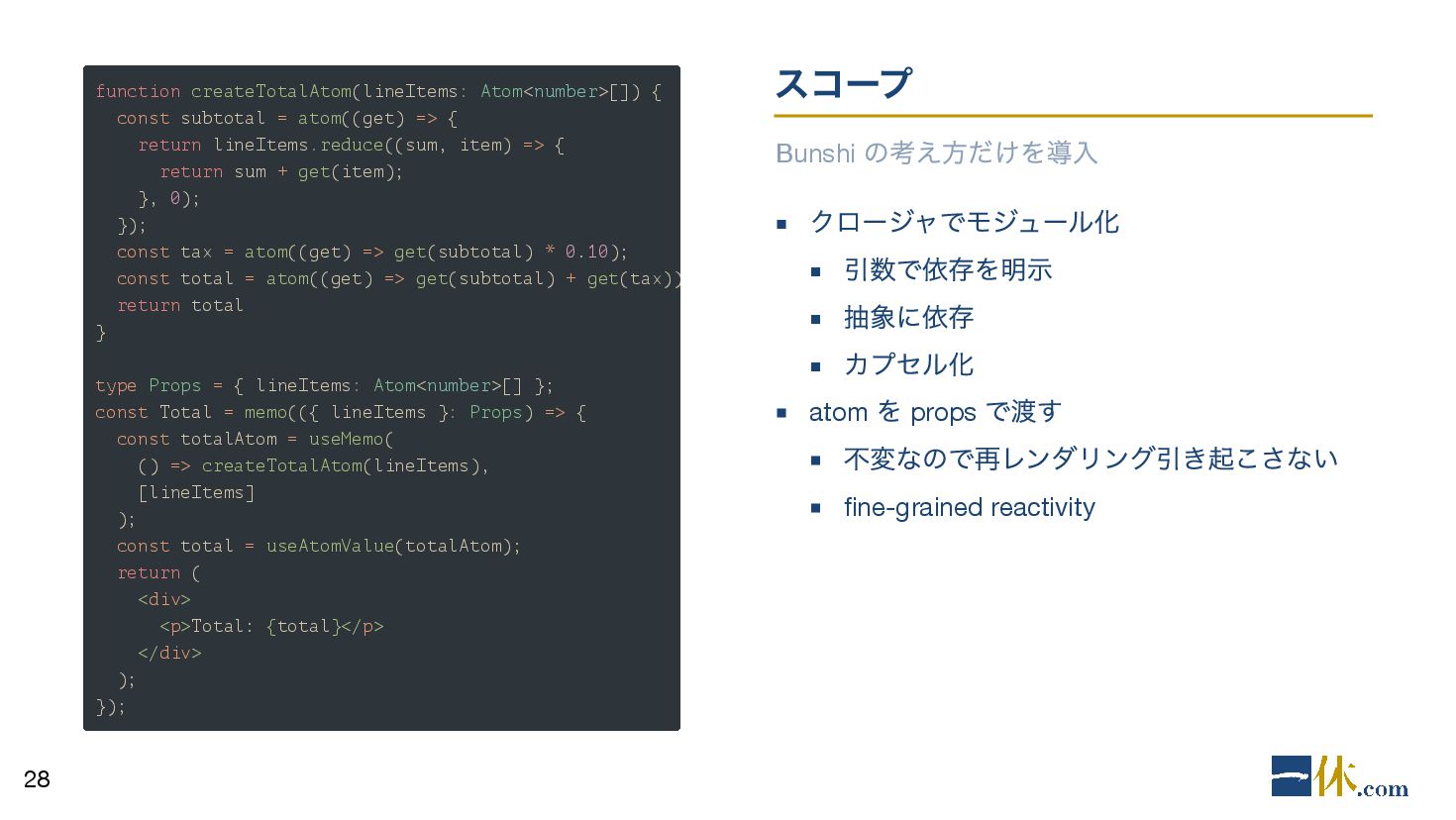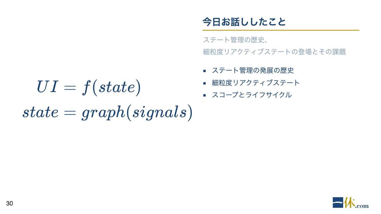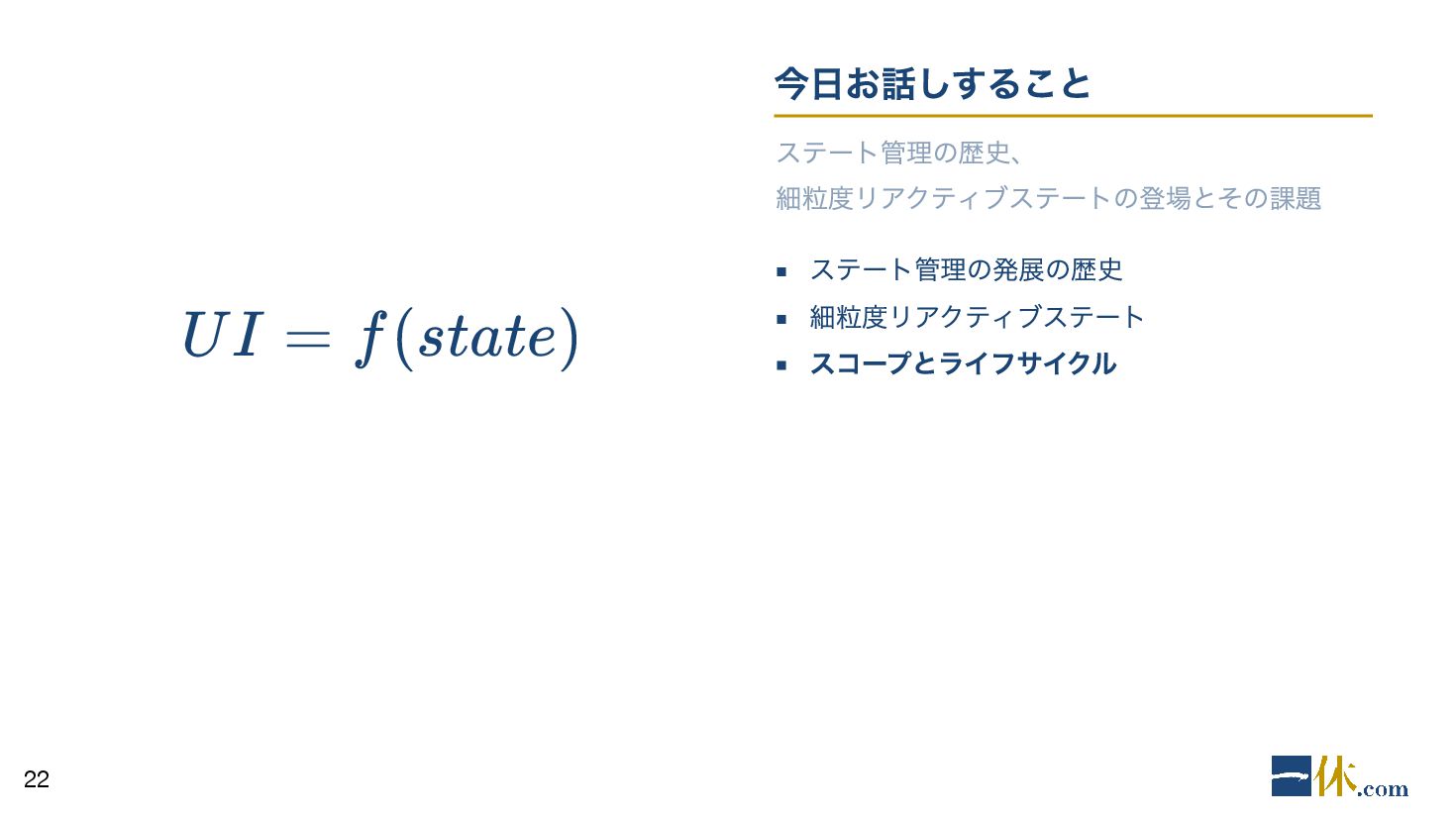 がほぼ不要) ロジックの分離・再利用 用途ごとに最適化した状態管理 SWR / React Query React Hook Form Zustand / Jotai / Valtio みえてきた課題 セマンティクスが複雑化 function Counter() { const { count, inc, dec } = useCounter(); return ( <div> <p>Count: {count}</p> <button onClick={inc}>+1</button> <button onClick={dec}>-1</button> </div> ); } function useCounter() { const [count, setCount] = useState(0); const inc = useCallback(() => { setCount(c => c + 1); }, []); const dec = useCallback(() => { setCount(c => c - 1); }, []); return { count, inc, dec }; } Functional Component の登場
